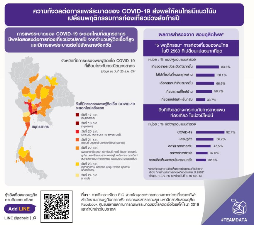 นอกจากนี้ ผลสำรวจยังพบว่าการแพร่ระบาดของ COVID-19 จะยังเป็นสถานการณ์ที่จะกระทบกับการวางแผนการท่องเที่ยวในช่วงปีใหม่ของคนไทยมากที่สุด โดยตัวอย่างที่เห็นได้ชัด คือ เหตุการณ์ความกังวลต่อการแพร่ระบาดในเชียงรายที่ยังอาจมีผลกระทบต่อเนื่องไปถึงการตัดสินใจไปเที่ยวในช่วงโค้งสุดท้ายของปีในจังหวัดดังกล่าว สะท้อนจากข้อมูลการค้นหาคำที่เกี่ยวข้องกับที่พักในจังหวัดเชียงรายบน Google ที่ลดลงหลังพบผู้ติดเชื้อนอก State Quarantine เมื่อวันที่ 29 พฤศจิกายน และผู้ติดเชื้อภายในประเทศเมื่อวันที่ 2 ธันวาคม โดยดัชนี Google Trends ลดลงต่ำสุดในช่วงวันที่ 13-19 ธันวาคม ที่ -46.9% เมื่อเทียบกับค่าเฉลี่ยในช่วงปี 2560-2562 ขณะที่เหตุการณ์ในจังหวัดสมุทรสาครมีผลโดยตรงต่อการท่องเที่ยวช่วงปลายปี เนื่องจากเริ่มมีการล็อกดาวน์ในหลายจังหวัดที่ตรวจพบผู้ติดเชื้อและความเชื่อมั่นของประชาชนต่อการควบคุมโรคของภาครัฐเริ่มลดลง รวมถึงการที่ห้างสรรพสินค้าและภาคเอกชนในจังหวัดที่มี