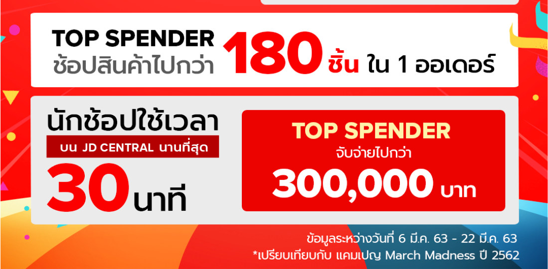 ช่วงเวลาจัดแคมเปญ March Madness นับว่าเป็นช่วงเวลาที่ท้าทายมาก เพราะเข้าสู่ช่วงมาตรการรักษาระยะห่าง แต่ได้เห็นถึงพฤติกรรมของกลุ่มลูกค้าที่เปลี่ยนแปลงไป มีพฤติกรรมชอปปิ้งออนไลน์สูงขึ้น โดยแบรนด์ที่ได้รับยอดคำสั่งซื้อสูงสุดได้แก่ Foremost, Protex และ Dettol ในขณะแบรนด์ที่มี ยอดขายสูงสุดได้แก่ Xiaomi, Huawei และ Samsung โดยนักช้อปออนไลน์ใช้เวลาบนแพลตฟอร์ม JD CENTRAL สูงสุด 30 นาทีบนแพลตฟอร์ม JD CENTRAL ทั้งยังมี Top Spender ที่จับจ่ายไปกว่า 180 ออเดอร์ และมี Top Spender ที่จับจ่ายสินค้ามูลค่าสูงถึง 300,000 บาทต่อการสั่งซื้อ”สำหรับประเภทสินค้าที่ได้รับความนิยมในแคมเปญนี้ จัดอันดับตามยอดคำสั่งซื้อสูงสุด ได้แก่ สินค้าประเภทแม่และเด็ก ตามมาด้วยสินค้าสุขภาพและความงาม และกลุ่มอาหารและเครื่องดื่ม