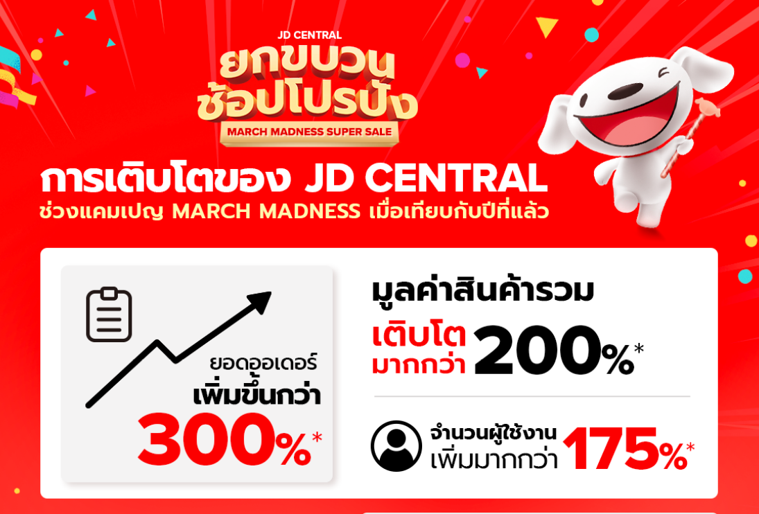 JD CENTRAL ธุรกิจเทคโนโลยีอีคอมเมิร์ซ และธุรกิจค้าปลีกในประเทศไทย เผยแคมเปญ “March Madness Super Sale ยกขบวนช้อป โปรปัง” แคมเปญใหญ่ประจำไตรมาสแรกของปี 2563 ทำยอดพุ่งกว่า 200% ชี้มาตรการรักษาระยะห่าง ดันยอดผู้ใช้งาน JD CENTRAL เพิ่มสูงกว่า 175% และยอดออเดอร์พุ่งสูงกว่า 300% เมื่อเทียบกับช่วงเวลาเดียวกันในปีที่แล้ว