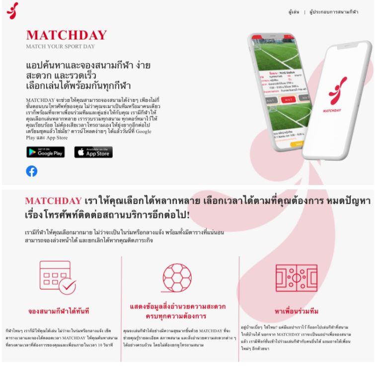 โดย MATCHDAY เป็นแพลตฟอร์มจองและบริหารสนามกีฬาที่รวบรวมทุกชนิดกีฬาไว้บนแพลตฟอร์มเดียวกัน โดยผู้ที่อยากจองกีฬาสามารถจองเข้าใช้บริการสนามกีฬาต่างๆ ได้ในเวลาที่สะดวกโดยไม่ต้องโทรศัพท์หาสนามที่ว่างอีกต่อไป และมีระบบบริหารสนามกีฬาสำหรับเจ้าของสนามกีฬา ทำให้สามารถจัดการบริหารธุรกิจสนามกีฬาได้อย่างง่ายมากขึ้น