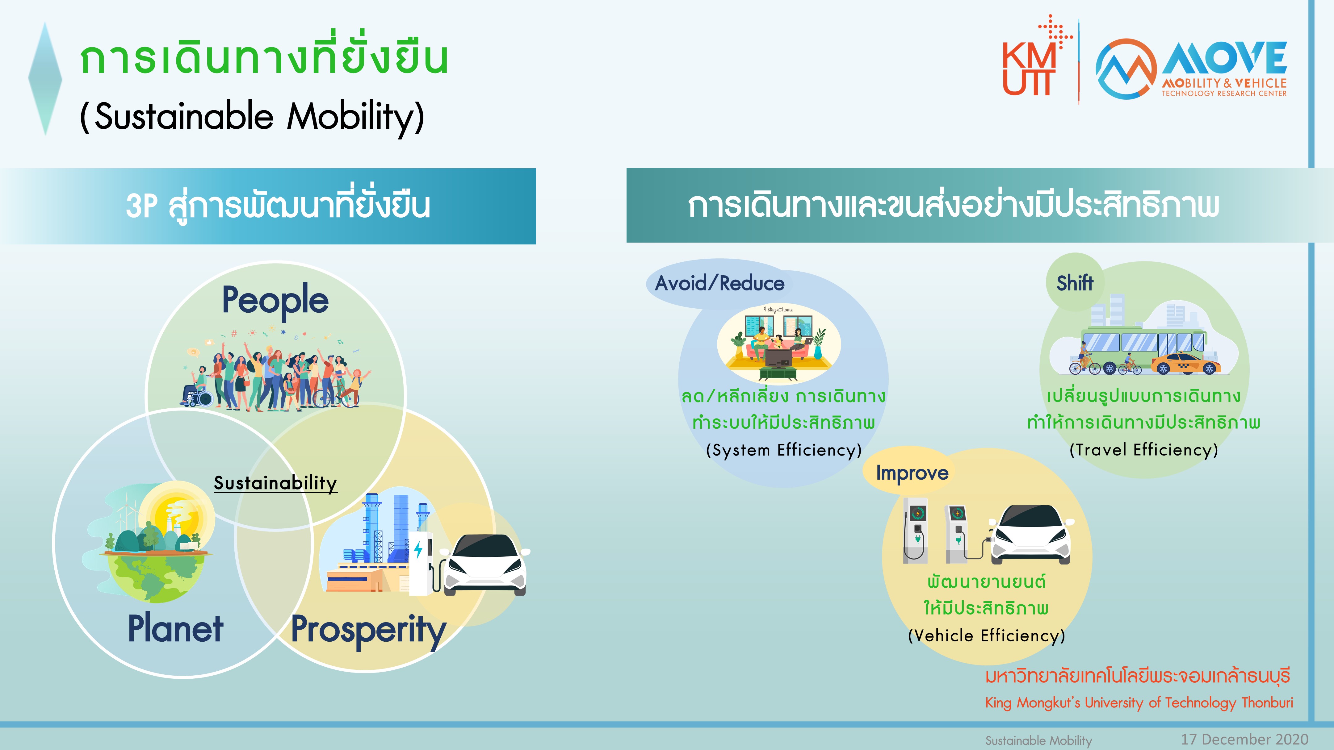 รศ. ดร. ยศพงษ์ ลออนวล เสนอแนวคิด “การเดินทางที่ยั่งยืน (Sustainable Mobility)” หมายถึง การเดินทางและขนส่งอย่างมีประสิทธิภาพที่คำนึงถึงผลกระทบต่อสิ่งแวดล้อม เศรษฐกิจ และสังคม โดยไม่สร้างปัญหาต่อคนรุ่นหลัง และมุ่งสู่การพัฒนาที่ยั่งยืน โดยมีหลักการของการเดินทางเเละขนส่งอย่างมีประสิทธิภาพ ประกอบไปด้วย 3 แนวทาง ได้แก่