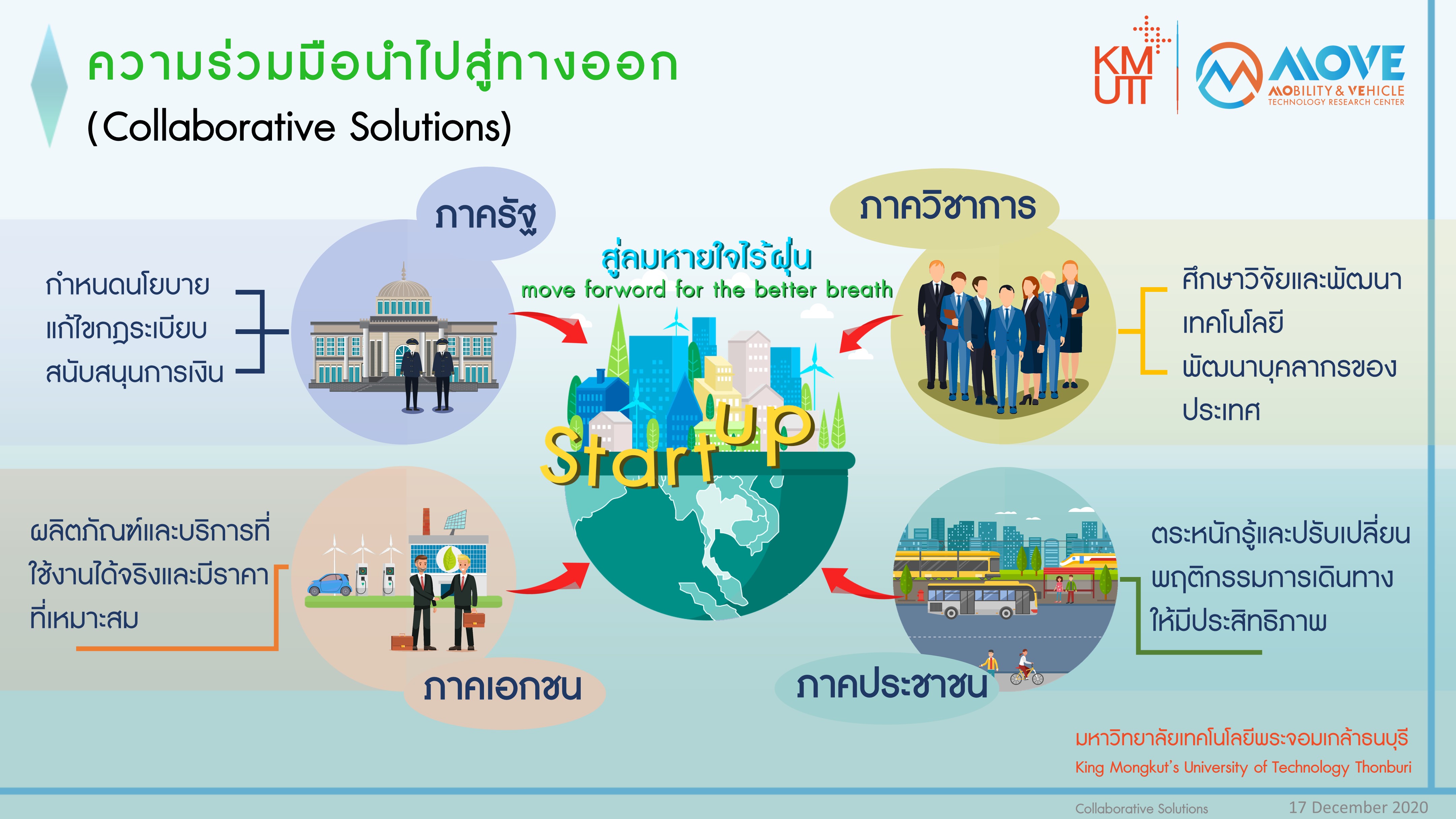 จากปัญหา PM2.5 ภาครัฐ ควรดำเนินการเร่งด่วนในการประกาศการบังคับใช้มาตรการระบาดมลพิษทางอากาศจากยานยนต์ใหม่ เป็นระดับยูโร 5 6 ภายในปี 64 เเละ 65 อย่างเป็นทางการ พร้อมทั้งส่งเสริมการใช้ยานยนต์ไฟฟ้าอย่างจริงจัง โดยภาครัฐต้องเริ่มก่อน เช่น รถโดยสารไฟฟ้าของ ขสมก. ส่วน ภาควิชาการ มีบทบาทสำคัญในการวิจัย เเละพัฒนาเทคโนโลยี เเละพัฒนาบุคลากรของประเทศ ภาคเอกชน ต้องพัฒนาผลิตภัณฑ์เเละบริการที่ใช้งานได้จริง เเละราคาที่เหมาะสม เพื่อกระตุ้นให้เกิดการใช้งานที่เหมาะสม เเละสุดท้ายคือ ภาคประชาชน ต้องร่วมมือกันปรับเปลี่ยนพฤติกรรม ในการเดินทางในวันนี้ สิ่งเหล่านี้จะนำไปสู่การเดินทางที่ยั่งยืน สู่ลมหายใจไร้ฝุ่น “Move forward for the better breath”