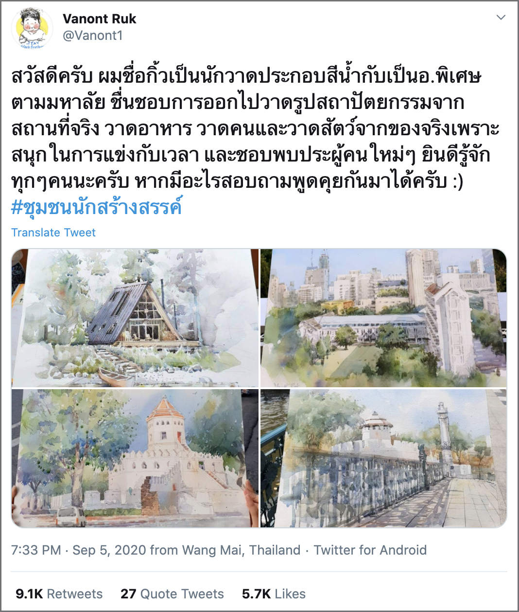 วนนท์ รักศิริพงษ์ (@vanont1) อาจารย์ด้านสถาปัตยกรรมและดีไซน์ ได้แสดงความคิดเห็นว่า “ทวิตเตอร์กลายเป็นพื้นที่สำหรับดีไซเนอร์และศิลปินรุ่นใหม่ๆ ได้แสดงผลงานของตัวเอง #ชุมชนนักสร้างสรรค์ เป็นชุมชนที่ศิลปินทั้งมืออาชีพและมือสมัครเล่นสามารถติดตามเทรนด์และอัปเดตงานศิลปะได้แบบเรียลไทม์ ทั้งยังเป็นพื้นที่ที่สามารถติดต่อพูดคุยเพื่อแบ่งปันไอเดียและศึกษาผลงานที่หลากหลายของศิลปินคนอื่นๆ ด้วย”
