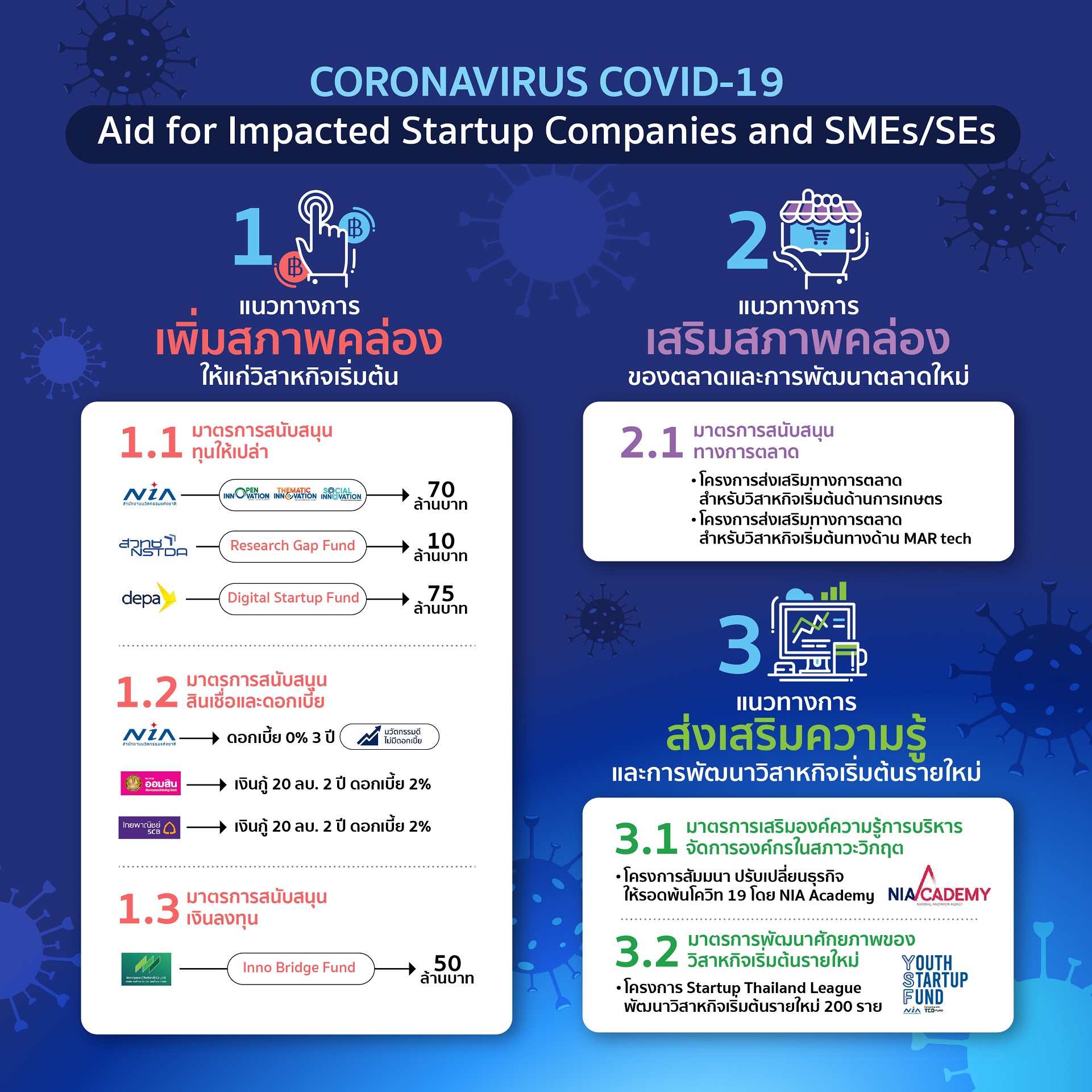 ดร. พันธุ์อาจ ชัยรัตน์ ผู้อำนวยการสำนักงานนวัตกรรมแห่งชาติ (องค์การมหาชน) หรือ NIA เปิดเผยว่า “ที่ผ่านมา NIA มีการพัฒนาระบบนิเวศที่เอื้อต่อการเติบโตของ Startup มาอย่างต่อเนื่อง ไม่ว่าจะเป็นทางด้านการเงิน การลงทุน การตลาด กฎระเบียบ เครือข่าย รวมถึงการเสนอแนวนโยบายและจัดทำร่างพระราชบัญญัติการพัฒนาและส่งเสริมวิสาหกิจเริ่มต้น เพื่อส่งเสริมและสนับสนุน Startup ไทยให้สามารถเติบโตอย่างก้าวกระโดด สำหรับวิกฤตการณ์การระบาดของเชื้อไวรัสโควิด 19 ในครั้งนี้ ถือว่าส่งผลกระทบต่อระบบเศรษฐกิจโดยรวมไปทั่วโลก ซึ่ง NIA ได้เตรียมมาตรการเพื่อให้ความช่วยเหลือ และฟื้นฟู Startup ธุรกิจนวัตกรรม หลังวิกฤตผ่านพ้นไป โดยแบ่งเป็น 3 ส่วน ได้แก่