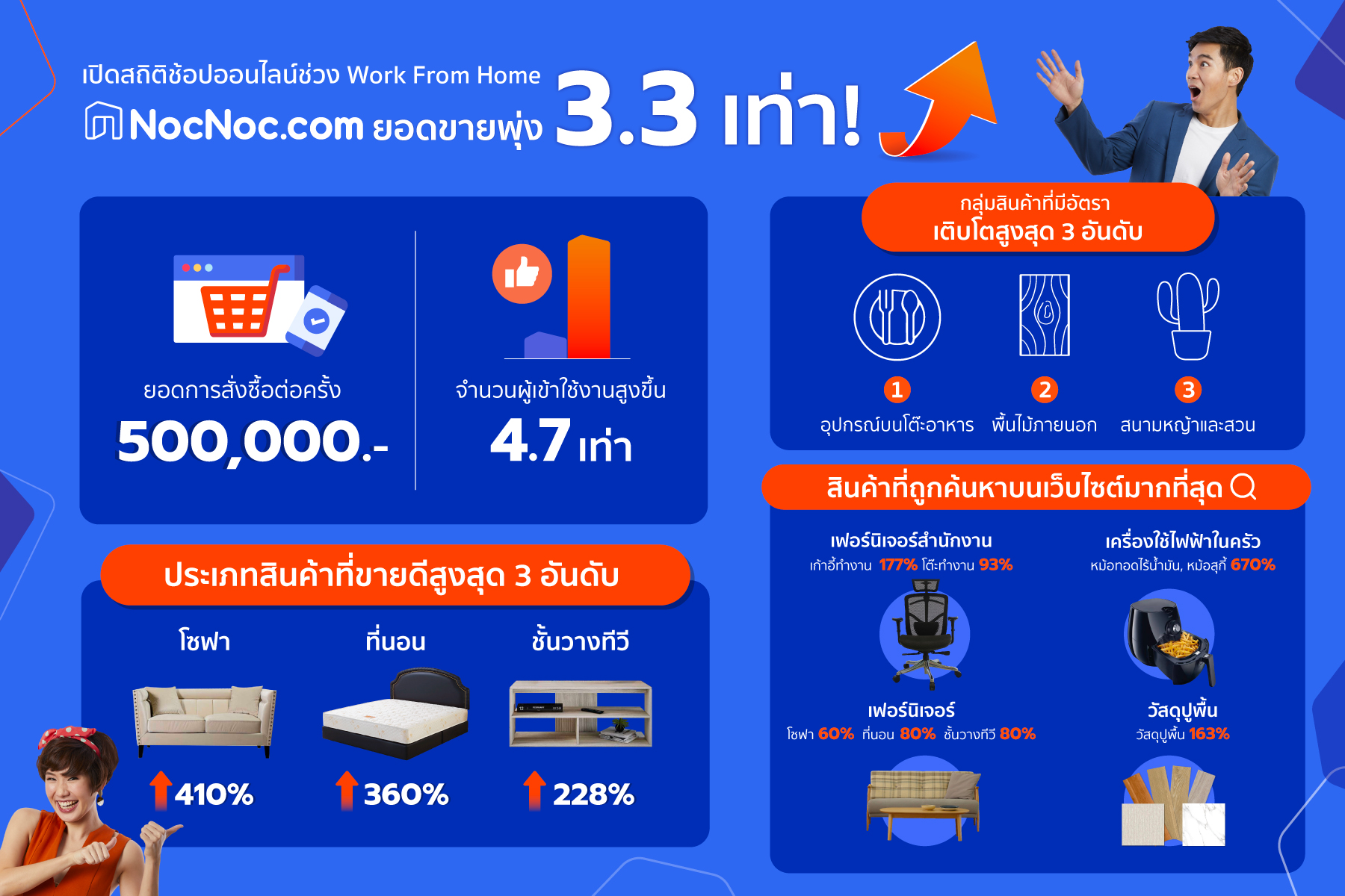 NocNoc.com ถือว่าได้รับผลกระทบในเชิงบวกส่งผลให้ตลอด 2-3 เดือนที่ผ่านมา มีผู้เข้าใช้งานสูงขึ้น คิดเป็น 4.7 เท่า ดันยอดขายพุ่งสูงขึ้นถึง 3.3 เท่า (เมื่อเทียบยอดขายเดือนม.ค. กับ เม.ย. 63) โดยมีการสั่งซื้อต่อครั้งสูงสุดที่ 500,000 บาทเลยทีเดียว