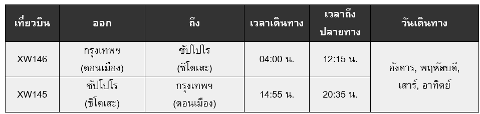 Nok Scoot สายการบินร่วมทุนราคาประหยัดระหว่างสายการบินนกแอร์ของคนไทย และสายการบินสกู๊ต จากประเทศสิงคโปร์ เดินหน้าสู่อีกหนึ่งก้าวแห่งความสำเร็จ เปิดเที่ยวบินปฐมฤกษ์จากกรุงเทพฯ (ดอนเมือง) สู่ซัปโปโร (นิวชิโตเสะ) เมื่อวันอาทิตย์ที่ 27 ตุลาคม 2562 ได้เปิดให้บริการเส้นทางบินตรงไปยังเมืองซัปโปโร เกาะฮอกไกโด ถือเป็นเส้นทางบินตรงที่สามสู่ประเทศญี่ปุ่น สอดคล้องกับแผนการเพิ่มทางเลือกให้แก่คนไทยในการเดินทางไปท่องเที่ยวที่ประเทศญี่ปุ่นได้ตลอดทั้งปี โดยให้บริการเที่ยวบินตรงด้วยเครื่องบินโดยสารแบบโบอิ้ง 777-200 แบ่งเป็นที่นั่งชั้นประหยัดพรีเมี่ยม (ScootPlus) 24 ที่นั่ง และที่นั่งชั้นประหยัด 391 ที่นั่ง