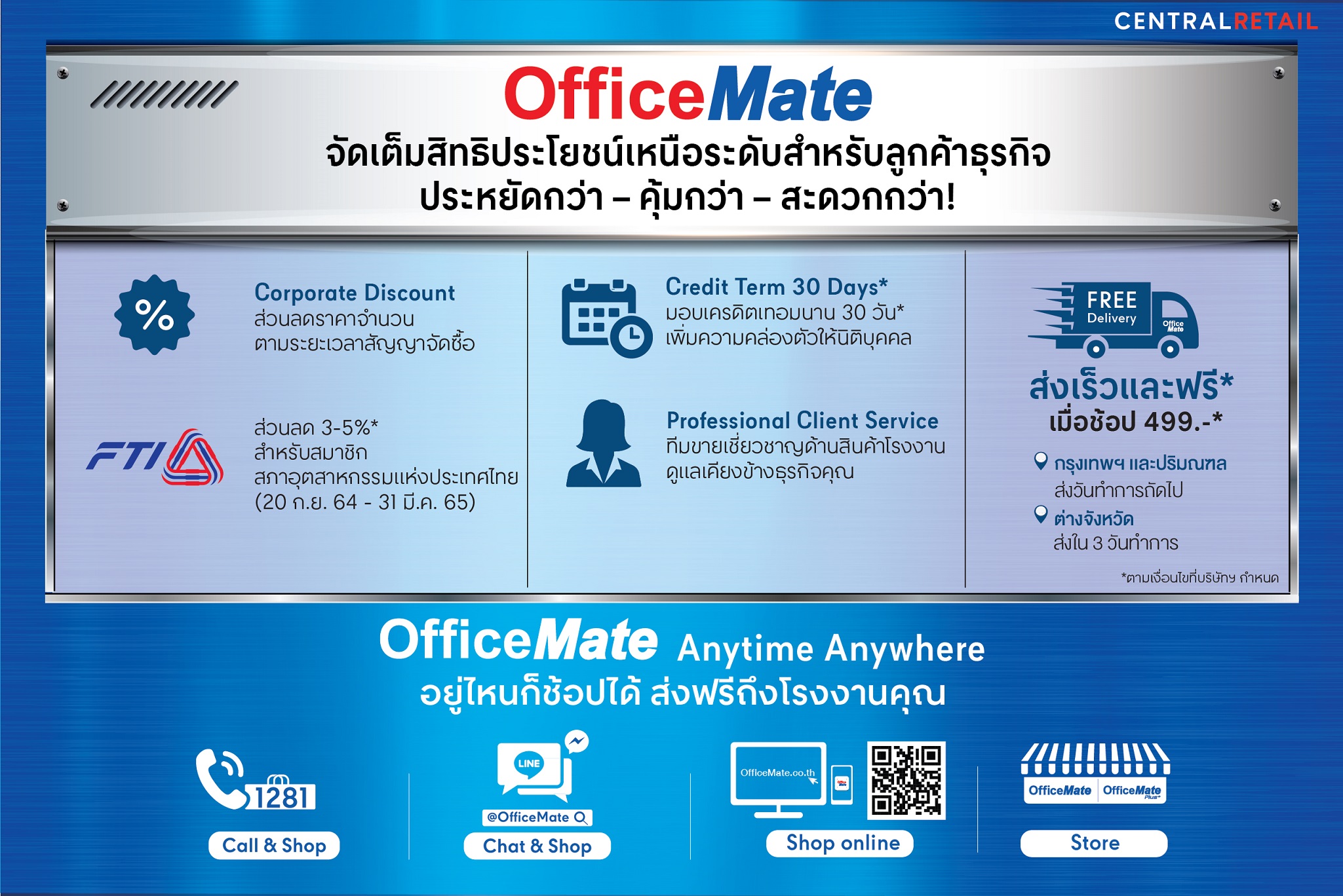 ลูกค้าสามารถรับข้อเสนอพิเศษได้ที่ OfficeMate Contact Center 1281 หรือแอด Line: @OfficeMate โดยคลิก http://bit.ly/LineOfficeMate หรือดูสินค้าและช้อปได้ทันทีที่เว็บไซต์ออฟฟิศเมท https://bit.ly/3CzofvQ พิเศษ! ลูกค้านิติบุคคลที่เป็นโรงงานและอุตสาหกรรม 100 ท่านแรกที่ลงทะเบียนกับออฟฟิศเมท รับสินค้าตัวอย่างสำหรับโรงงานคุณมูลค่ากว่า 500 บาท ฟรี**! ที่ https://forms.gle/33W7kfAXP3mUrn4Y6
