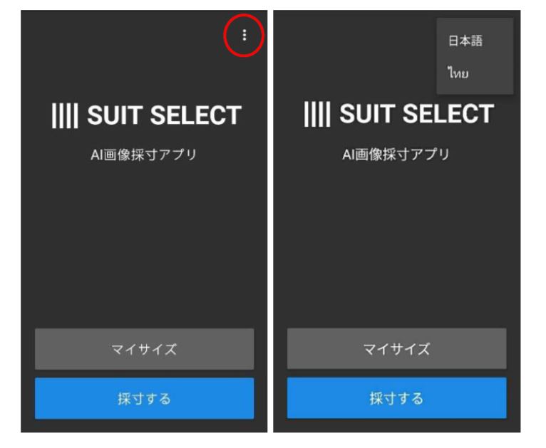 หลังจากดาวน์โหลดแอปพลิเคชั่นจาก Google Play / App Store แล้ว เมื่อเปิดใช้งานแอปพลิเคชั่นครั้งแรก ภาษาในแอปพลิเคชั่นจะถูกตั้งค่าเป็นภาษาญี่ปุ่นโดยอัตโนมัติ ผู้ใช้ต้องเปลี่ยนภาษาเป็นภาษาไทยเพื่อให้แอปพลิเคชั่นเชื่อมกับร้าน SUIT SELECT ในประเทศไทย โดยสามารถเปลี่ยนภาษาได้ที่เมนูด้านมุมขวาบน