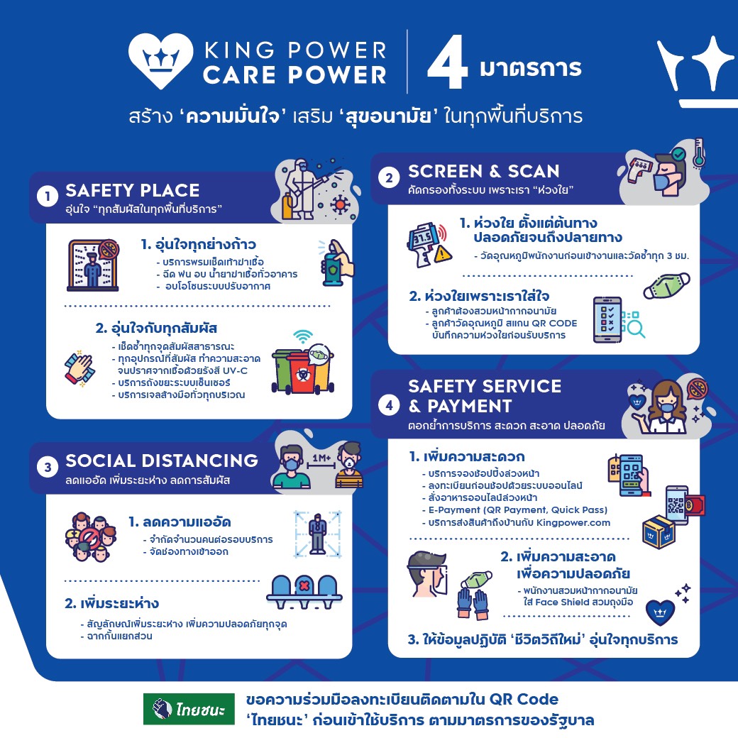 กลุ่มบริษัท คิง เพาเวอร์ พร้อมให้บริการตอบโจทย์ไลฟ์สไตล์ลูกค้าชาวไทย รวมถึงนักเดินทาง นักท่องเที่ยวทั่วโลก วางยุทธศาสตร์มาตรฐานสุขอนามัยระดับสากล KING POWER CARE POWER พร้อม 4 มาตรการความสะอาด สร้างความมั่นใจ เสริมสุขอนามัย ในทุกพื้นที่บริการ ครอบคลุมทุกธุรกิจ