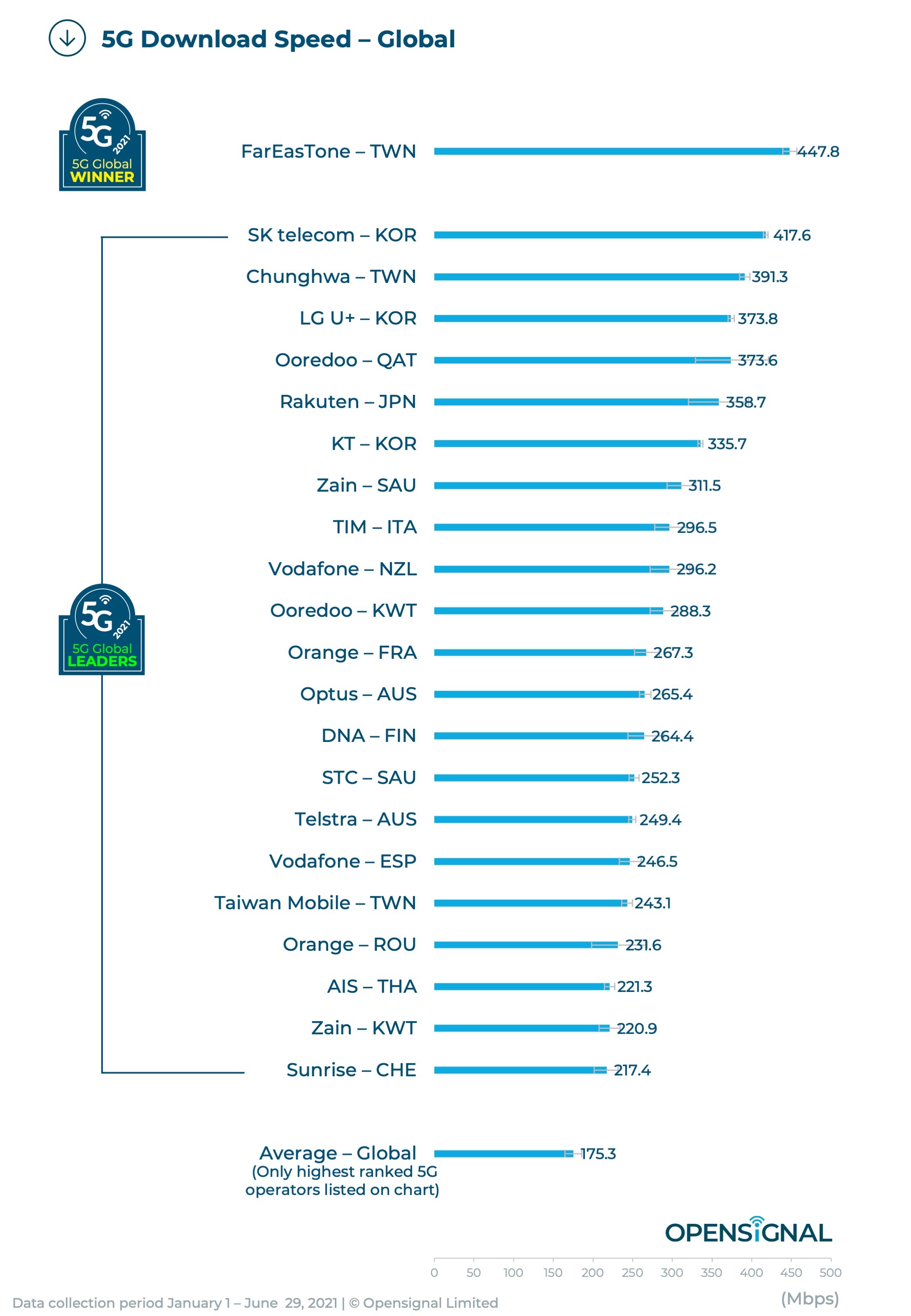 ด้วยความเร็วในการดาวน์โหลด 5G เฉลี่ย 447.8 Mbps ผู้ใช้ FarEasTone ในไต้หวันจึงเพลิดเพลินไปกับการดาวน์โหลด 5G ที่มีความเร็วที่สุดในโลก ผู้ให้บริการในภูมิภาคเอเชียตะวันออกมีความโดดเด่นในหมวดหมู่นี้ โดย 4 จาก 6 อันดับเป็นผู้ให้บริการชั้นนำในเอเชียตะวันออก นับรวม FarEasTone ส่วน SK Telecom จากเกาหลีใต้ที่มีความเร็วในการดาวน์โหลด 5G อยู่ที่ 417.6 Mbps จัดว่าเป็นความเร็วสูงสุดอันดับที่สองโดยตามมาด้วย Chunghwa จากไต้หวันด้วยความเร็วที่ 391.3 Mbps