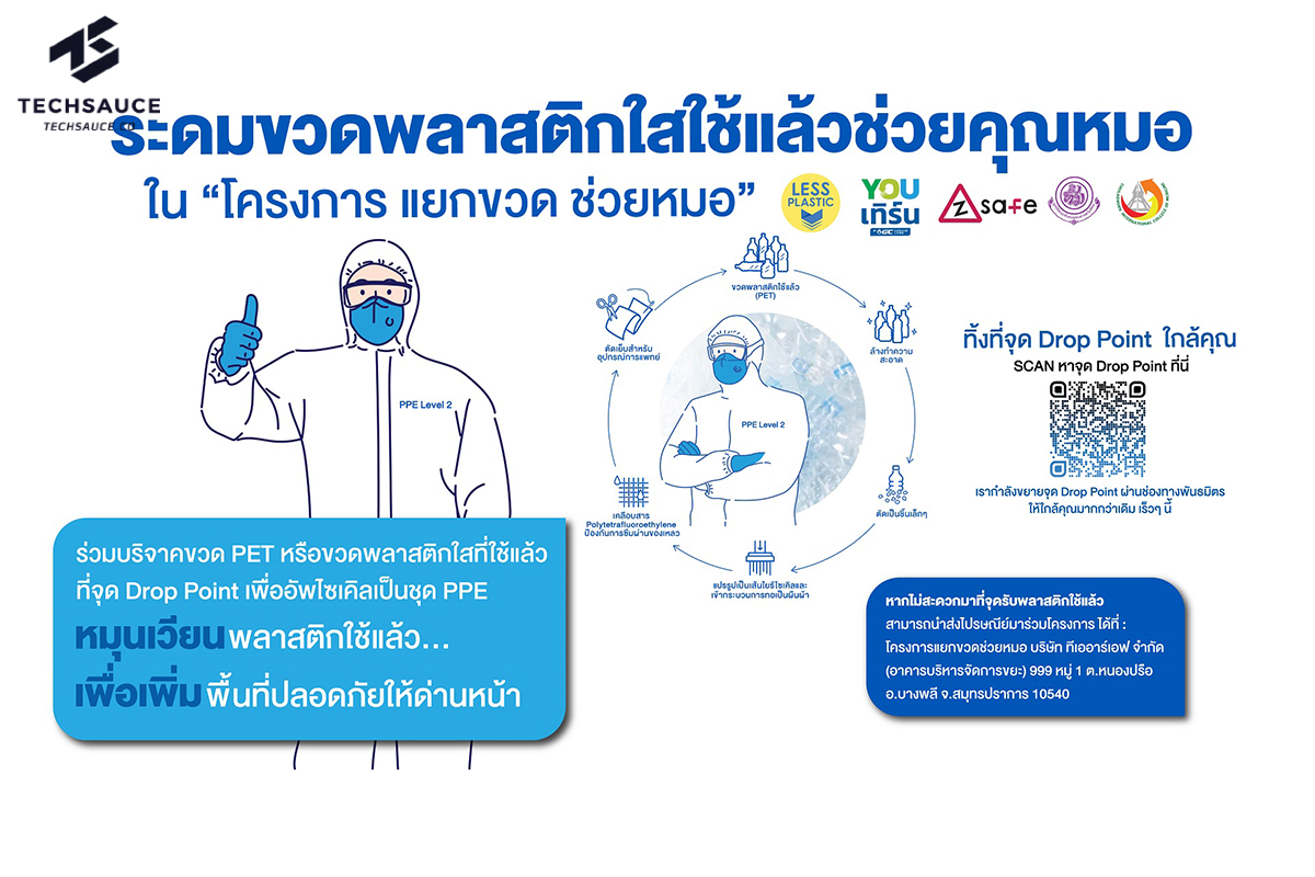 ภารกิจสานต่อกลับมาอีกครั้ง!!ในการระดมขวดพลาสติก (PET)จำนวนขั้นต่ำ 5,000 ชุดจากประชาชนที่ใช้แล้วมาสร้างมูลค่าเพิ่มในการนำมาแปรรูปตัดเย็บชุดป้องกันส่วนบุคคล(PPE)ให้กับบุคลากรทางการแพทย์ โดย“โครงการแยก ขวด ช่วยหมอ” กลับมาดำเนินการ จากความร่วมมือพันธมิตรจาก 5 องค์กร ผ่านเฟซบุ๊ค “เพจ Less Plastic Thailand” ตั้งเป้าในการส่งมอบชุด PPE Level 2 แบบซักสะอาดใช้ซ้ำได้ 20 ครั้ง (Reusable PPE) เพื่อส่งมอบให้แก่มูลนิธิคณะทันตแพทยศาสตร์มหิดล และวิทยาลัยแพทยศาสตร์นานาชาติ จุฬาภรณ์ มหาวิทยาลัยธรรมศาสตร์ เพื่อนำไปบริจาคในพื้นที่ขาดแคลน