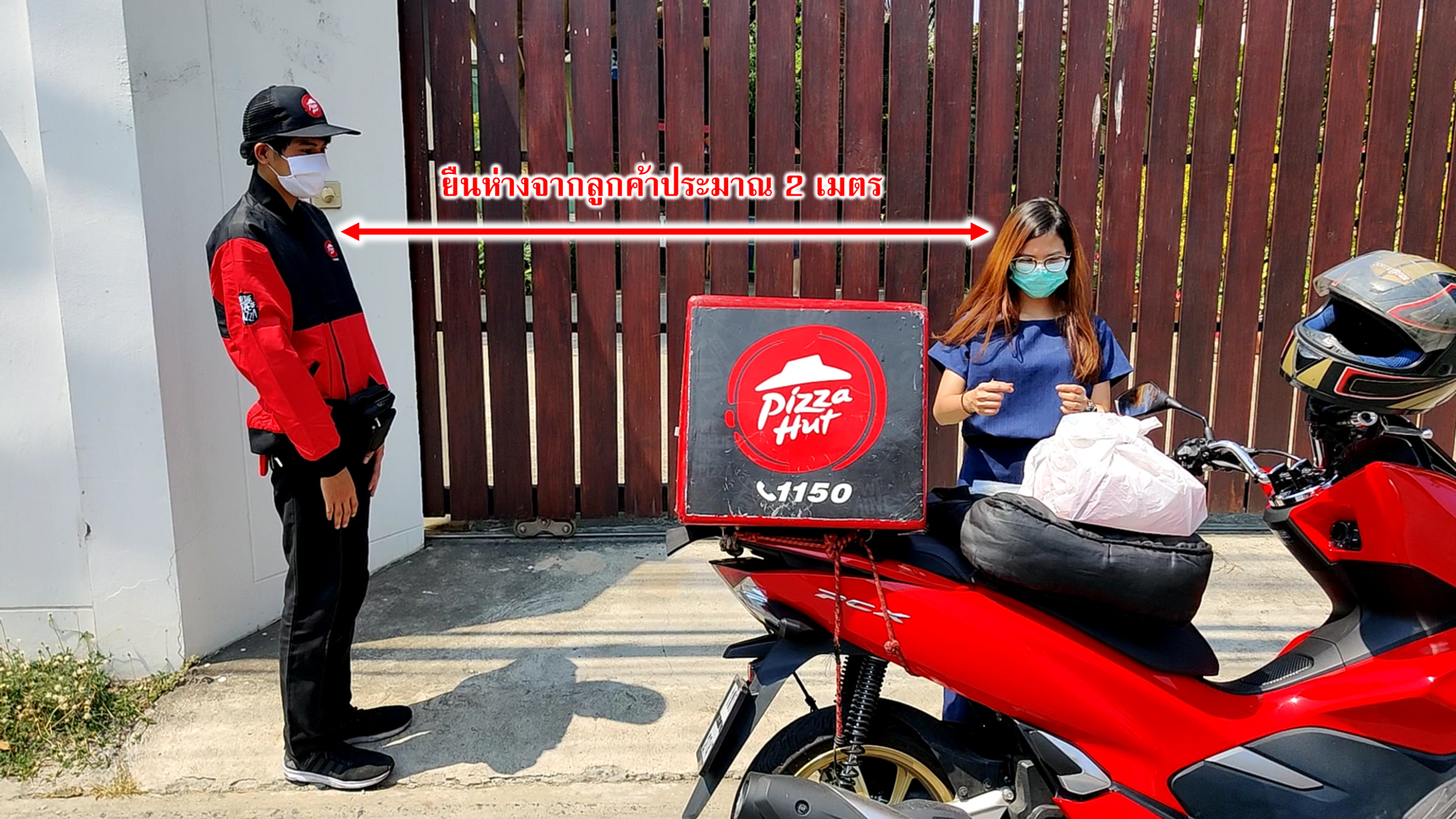 ในการให้บริการนั้น พนักงานส่ง PIZZA Hut จะสวมหน้ากากอนามัย และทำความสะอาดมือด้วยแอลกอฮอล์ก่อนสัมผัสกล่องพิซซ่าฮัท โดยนำอาหารทั้งหมดใส่ถุงพลาสติคและวางบนกระเป๋าร้อน พร้อมเงินทอนบรรจุในถุงซิป (ในกรณีที่มีเงินทอน) จากนั้น พนักงานส่ง PIZZA Hut จะถอยห่างจุดรับ-ส่ง โดยทิ้งระยะ 2เมตร เพื่อให้ลูกค้าเดินมารับและตรวจสอบรายการอาหาร และเงินทอน (ในกรณีมีเงินทอน) พร้อมวางเงินสดชำระค่าอาหาร แล้ว พนักงานส่ง PIZZA Hut จะรอจนลูกค้าทิ้งระยะ 2เมตร จึงเดินมารับเงินสดที่ลูกค้าชำระค่าอาหาร