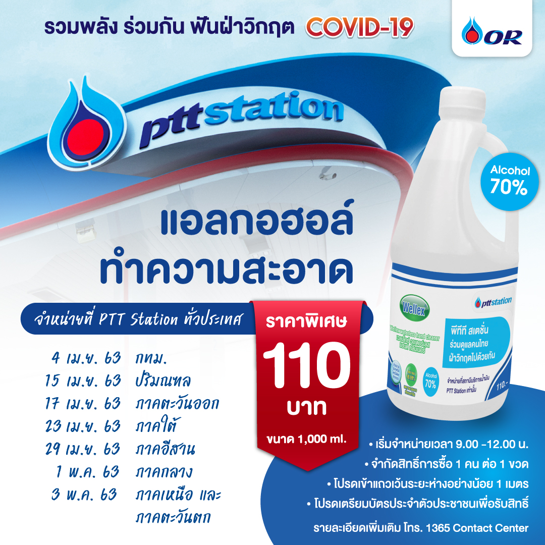 PTT Station พร้อมจำหน่ายแอลกอฮอล์เข้มข้น70% ราคาพิเศษ 1แสนขวด ขวดละ 110 บาท ( บรรจุปริมาณ 1 ลิตร) ซึ่งเป็นราคาที่ต่ำกว่าท้องตลาดโดยแอลกอฮอล์ดังกล่าวใช้สำหรับทำความสะอาดได้ เริ่ม 4 เม.ย. นี้