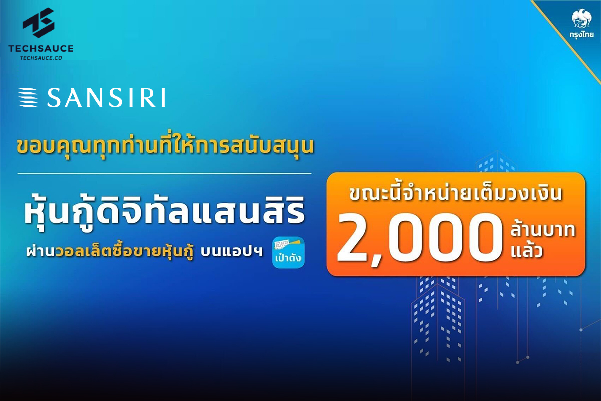 'หุ้นกู้ดิจิทัลแสนสิริ' สร้างประวัติศาสตร์หน้าใหม่ ประชาชนตอบรับจองซื้อผ่าน 'แอปพลิเคชั่นเป๋าตัง' อย่างล้นหลาม กวาดยอดขายครบ 2,000 ล้านบาท ภายใน 3นาที 38 วินาที ตอกย้ำความสำเร็จของความร่วมมือระหว่าง “แสนสิริ” และ “กรุงไทย” เปิดขายหุ้นกู้ภาคเอกชนออนไลน์เต็มรูปแบบผ่านวอลเล็ต เป็นอสังหาริมทรัพย์ “รายแรกในเอเชีย” ตอบโจทย์ผู้ลงทุนยุคใหม่ ซื้อขาย ขายง่ายได้ทันที 24 ชั่วโมง ให้คนไทยทุกคนเข้าถึงการลงทุนได้อย่างทั่วถึงและเท่าเทียม