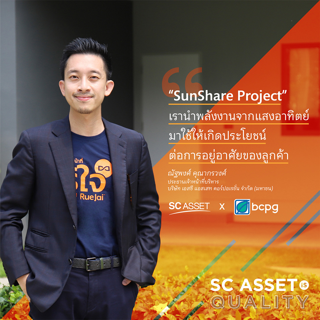 คุณบัณฑิต สะเพียรชัย กรรมการผู้จัดการใหญ่ บริษัท บีซีพีจี จำกัด (มหาชน) กล่าวว่า “ ในฐานะหนึ่งในผู้บุกเบิกนำนวัตกรรมระดับโลกมาใช้ในธุรกิจพลังงาน บีซีพีจีมีความภูมิใจที่ได้มีส่วนร่วมสร้าง Quality Living ให้แก่ลูกค้าของ SC ASSET โดยการนำพลังงานแสงอาทิตย์มาผลิตเป็นไฟฟ้าสำหรับใช้ภายในครัวเรือน และสามารถนำไฟฟ้าที่ผลิตได้เกินความต้องการไปทำประโยชน์ให้กับสังคมส่วนรวม บริษัทฯ จะเป็นผู้ออกแบบ ติดตั้ง และดูแลระบบแลกเปลี่ยนซื้อขายไฟฟ้าให้ทั้งหมด โดยจะเริ่มต้นในช่วงไตรมาส 3 ของปีนี้ และมีแผนขยายกำลังการผลิตเพิ่มเติมเพื่อรองรับความต้องการพลังงานสะอาดจากโครงการต่างๆ ในอนาคต ”