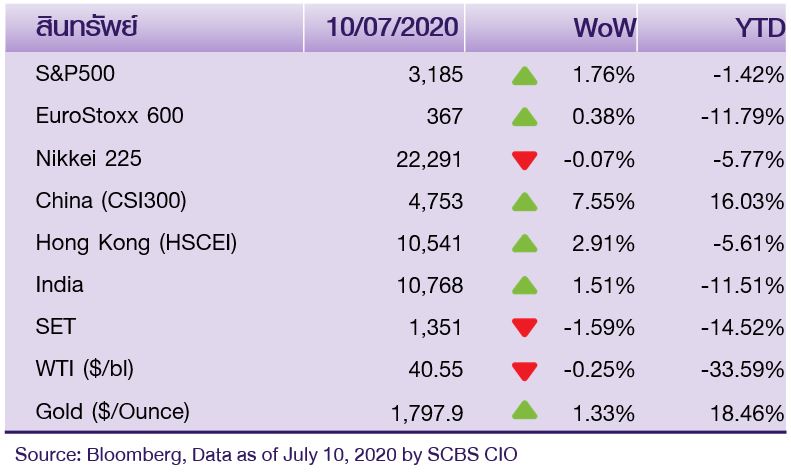 ในสัปดาห์ที่ผ่านมา 6 – 10 ก.ค. ตลาดหุ้นส่วนใหญ่ปิดบวก โดยตลาดหุ้นสหรัฐฯ ปรับเพิ่มขึ้น จากตัวเลขเศรษฐกิจสหรัฐฯที่ออกมาดี เช่น ดัชนี ISM ภาคบริการ และการจ้างงานนอกภาคเกษตร นอกจากนี้ ดัชนีฯยังได้แรงหนุนจากความคืบหน้าในการพัฒนาวัคซีน และยาต้านไวรัส หลัง Gilead ซึ่งเป็นบริษัทผลิตยาของสหรัฐฯ เปิดเผยผลการทดลองพบว่า ยา remdesivir สามารถลดอัตราการเสียชีวิตของผู้ป่วยโควิด-19 ได้ถึง 62% เมื่อเทียบกับการรักษาด้วยวิธีมาตรฐาน