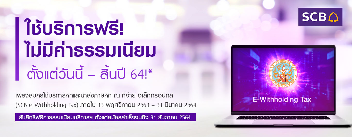 ธนาคารไทยพาณิชย์ จึงจัดแคมเปญ “SCB e-withholding Tax สมัครภายใน 31 มี.ค.64 ใช้ฟรีตลอดปี 2564” โดยจะยกเว้นค่าธรรมเนียมบริการหักและนำส่งภาษีหัก ณ ที่จ่ายอิเล็กทรอนิกส์ทุกรายการให้กับผู้ประกอบการที่สมัครใช้บริการ SCB e-Withholding Tax สำหรับผู้ประกอบการที่สมัครใช้บริการตั้งแต่วันที่ 13 พฤศจิกายน 2563 – 31 มีนาคม 2564 ด้วยวัตถุประสงค์เพื่อกระตุ้นและจูงใจให้ผู้ประกอบการทุกกลุ่มทั้งธุรกิจขนาดใหญ่ และธุรกิจเอสเอ็มอีเข้ามาใช้ระบบภาษีหัก ณ ที่จ่ายอิเล็กทรอนิกส์มากขึ้น เพราะเชื่อว่าเมื่อได้ใช้งานจริงแล้วจะมองเห็นประโยชน์ของระบบ e-Withholding Tax ที่มีต่อตัวธุรกิจ และคู่ค้า ตลอดจนเป็นการยกระดับระบบภาษีของประเทศที่มีความโปร่งใส ทันสมัย เท่าทันต่อสภาพแวดล้อมทางเศรษฐกิจในยุคดิจิทัลปัจจุบัน