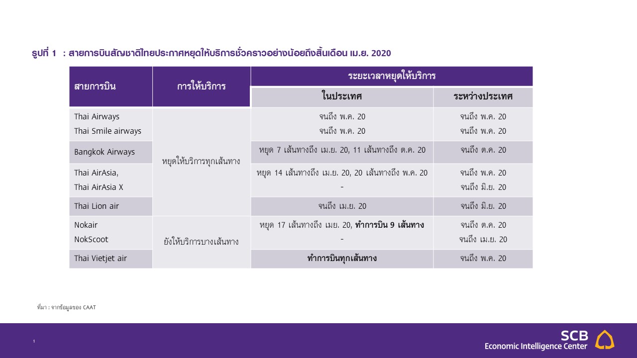 ในส่วนของไทย COVID-19 ส่งผลกระทบอย่างรุนแรงต่อธุรกิจการบินจนทำให้หลายสายการบินต้องหยุดให้บริการชั่วคราวตั้งแต่เดือน มี.ค. 2020 จนอย่างน้อยถึงสิ้นเดือน เม.ย. 2020 โดยในเส้นทางระหว่างประเทศ สายการบินสัญชาติไทยต่างหยุดให้บริการบินทั้งหมด เช่น Thai lion air ในช่วง 25 มี.ค. – 30 มิ.ย. 2020, Thai airways ในช่วง 25 มี.ค. – 31 พ.ค. 2020, Thai AirAsia ในช่วง 27 มี.ค. – 24 เม.ย. 2020 เป็นต้น (ดังรูปที่ 1) โดยเป็นผลจากปริมาณผู้โดยสารในเส้นทางระหว่างประเทศที่เริ่มปรับลดลงต่อเนื่องตั้งแต่ปลายเดือน ม.ค. 2020 และปรับลดลงมากยิ่งขึ้นภายหลังสำนักงานการบินพลเรือนแห่งประเทศไทย (Civil Aviation Authority of Thailand: CAAT) ออก