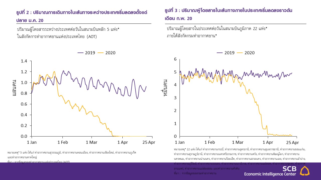 แนวปฏิบัติสำหรับผู้ดำเนินการเดินอากาศที่ทำการบินมายังไทย ซึ่งบังคับให้ผู้เดินทางต้องมีใบรับรองแพทย์และประกันสุขภาพ จึงทำให้ปริมาณผู้โดยสารระหว่างประเทศใน 5 สนามบินหลักของท่าอากาศยานไทย (Airports of Thailand: AOT) ปรับลดลงอย่างต่อเนื่องจนเกือบ -100%YOY (ดังรูปที่ 2) ส่วนเส้นทางภายในประเทศ สายการบิน Thai AirAsia และ Thai Lion air ซึ่งมีส่วนแบ่งตลาดจากปริมาณผู้โดยสารรวมกันกว่า 50% ได้เริ่มหยุดบินตั้งแต่ช่วงปลายเดือน มี.ค. 2020 ตามปริมาณผู้โดยสารทั้งชาวต่างชาติและชาวไทยที่เริ่มปรับลดลงจนกระทั่ง ณ ต้นเดือน เม.ย. 2020 ปริมาณผู้โดยสารในสนามบินภูมิภาค 22 แห่งลดลงกว่า -98% ต่อวัน (ดังรูปที่ 3) ทั้งนี้สายการบินที่ขอหยุดบริการชั่วคราวสามารถขออนุญาตจาก CAAT เพื่อกลับมาบินก่อนกำหนดได้