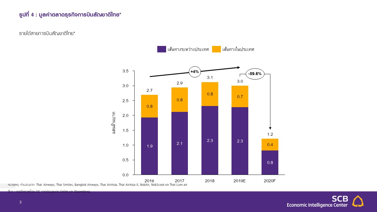 จากสมมติฐานดังกล่าว EIC คาดว่า 1.) รายได้ธุรกิจการบินสัญชาติไทยจากเส้นทางระหว่างประเทศจะหดตัวกว่า -65%YOY มาอยู่ที่ราว 8.2 หมื่นล้านบาท โดยมีปัจจัยหลักจากการลดลงของนักท่องเที่ยวต่างชาติซึ่งมีสัดส่วนราว 80% ของผู้โดยสารเส้นทางระหว่างประเทศทั้งหมด ซึ่ง EIC คาดการณ์ในกรณี base case ว่านักท่องเที่ยวต่างชาติที่เดินทางมาไทยจะลดลงราว -67%YOY จาก 39.8 ล้านคนในปี 2019 เหลือเพียง 13.1 ล้านคนในปี 2020 และปัจจัยรองจากการหดตัวของชาวไทยที่ไม่สามารถเดินทางไปต่างประเทศได้อีกด้วย ซึ่งเป็นผลจากมาตรการห้ามเดินทางออกนอกประเทศของรัฐบาลหลายประเทศจากการแพร่ระบาดโรค COVID-19 ความกังวลของนักเดินทางกับการติดเชื้อ และสภาวะเศรษฐกิจโลกที่เข้าสู่ภาวะถดถอยทำให้รายได้ลดลง ส่งผลให้รายได้ของสายการบินลดลงตามไปด้วย ส่วน 2.) รายได้จากเส้นทางบินภายในประเทศมีแนวโน้มลดลง -45%YOY มาอยู่ที่ราว 3.9 หมื่นล้านบาท โดยส่วนหนึ่งเป็นผลจากนักท่องเที่ยวต่างชาติที่เข้ามาท่องเที่ยวในประเทศลดลงและอีกส่วนหนึ่งเป็นผลจากการชะลอตัวของการเดินทางภายในประเทศของชาวไทยจากความกังวลในการระบาดของโรค COVID-19 รวมถึงรายได้ที่ลดลงจากปัญหาสภาวะเศรษฐกิจภายในประเทศเช่นเดียวกัน