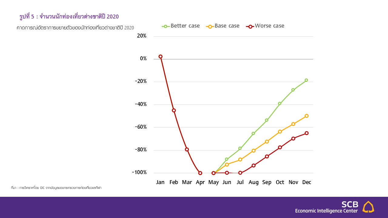 (ดังรูปที่ 4) ภายใต้สมมติฐานการฟื้นตัวในธุรกิจสายการบินอย่างค่อยเป็นค่อยไปแบบ U-Shape ในลักษณะเดียวกับการประมาณการฟื้นตัวของจำนวนนักท่องเที่ยวชาวต่างชาติในไทยของ EIC กรณี base case (ดังรูปที่ 5) โดยการฟื้นตัวจาก COVID-19 จะค่อนข้างช้ากว่าการฟื้นตัวจากไวรัส SARS และ MERS