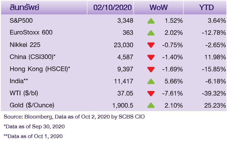 ในสัปดาห์ที่ผ่านมา (28 ก.ย.-2 ต.ค.) ตลาดหุ้นสหรัฐฯ ปรับเพิ่มขึ้น ตามตัวเลขเศรษฐกิจสหรัฐฯ ที่ยังออกมาดี เช่น ดัชนีความเชื่อมั่นผู้บริโภค และการจ้างงานภาคเอกชน ประกอบกับความคาดหวังมาตรการกระตุ้นเศรษฐกิจรอบใหม่ หลังสภาผู้แทนราษฎรสหรัฐฯ เห็นชอบร่างกฎหมายงบประมาณวงเงิน 2.2 ล้านล้านดอลลาร์สหรัฐฯ อย่างไรก็ตาม ดัชนีฯ ลดช่วงบวกลง ตามความไม่แน่นอนในการเลือกตั้งประธานาธิบดีสหรัฐฯ ที่เพิ่มขึ้น หลังการโต้วาทีระหว่างประธานาธิบดีทรัมป์ และนายไบเดนเป็นไปอย่างสูสี ประกอบกับได้มีรายงานการติดเชื้อไวรัสโควิด-19 ของประธานาธิบดีทรัมป์ ด้านตลาดหุ้นยุโรปปิดบวกเช่นกัน จากแรงซื้อหุ้นกลุ่มธนาคาร หลังธนาคารผิง อันของจีน ซึ่งเป็นผู้ถือหุ้นรายใหญ่ที่สุดของเอชเอสบีซี ได้เพิ่มการถือหุ้นเอชเอสบีซี นอกจากนี้ ดัชนีฯ ยังได้แรงหนุนจากนางอังเกลา แมร์เคิล นายกรัฐมนตรีเยอรมนี แสดงความเชื่อมั่นเกี่ยวกับความเป็นไปได้ที่อังกฤษ และสหภาพยุโรป จะสามารถบรรลุข้อตกลงการค้าได้ก่อนสิ้นปีนี้ สำหรับตลาดหุ้นจีน (A-Share) ปรับลดลง จากความตึงเครียดระหว่างสหรัฐฯ และจีนที่เพิ่มขึ้น หลังทางการสหรัฐฯ ได้สั่งควบคุมการส่งออกอุปกรณ์ให้กับ SMIC บริษัทผลิตชิปรายใหญ่ที่สุดของจีน ประกอบกับมีแรงขายกำไรออกมาบางส่วน ก่อนที่ตลาดหุ้นจีนหยุดยาวในช่วงวันชาติจีน ตั้งแต่วันที่ 1 ถึง 8 ต.ค. ด้านราคาน้ำมันดิบปรับลดลงค่อนข้างมาก จากความกังวลด้านอุปทานที่เพิ่มขึ้น หลังมีรายงานว่าลิเบียและอิหร่านได้เพิ่มการส่งออกน้ำมัน รวมทั้งกำลังการผลิตของกลุ่มโอเปกในเดือน ก.ย.เพิ่มขึ้น 1.6 แสนบาร์เรล นอกจากนี้ ความกังวลเกี่ยวกับยอดผู้ติดเชื้อโควิด-19 ที่ยังเพิ่มขึ้นทั่วโลก อาจส่งผลกระทบต่อความต้องการใช้น้ำมันโลกในระยะต่อไป
