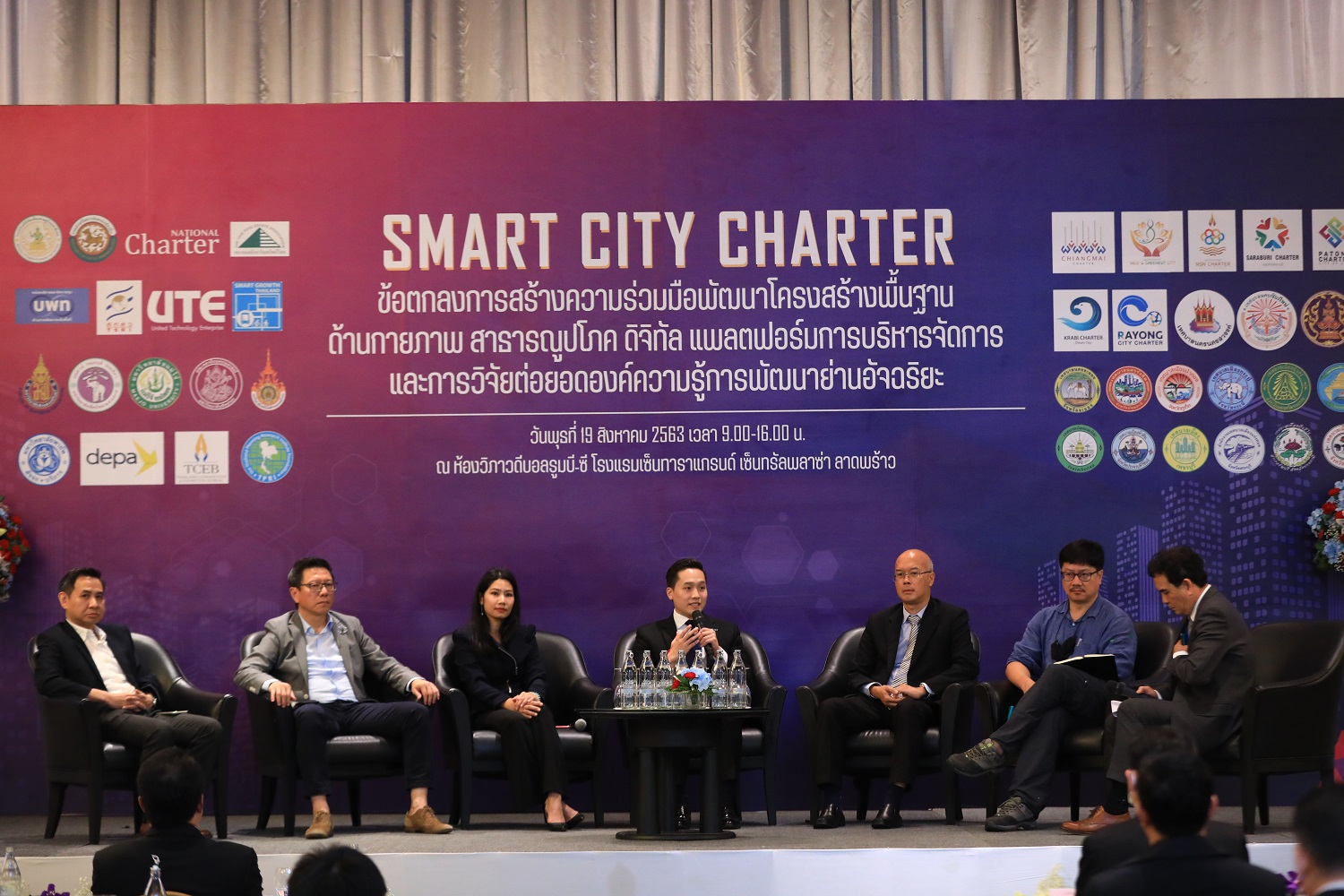 ตามกรอบกฎบัตรเมืองอัจฉริยะ (Smart City Charter) อันเป็นความร่วมมือของ สมาคมการผังเมืองไทย สมาคมอสังหาริมทรัพย์ไทย บริษัทยูไนเต็ด เทคโนโลยี เอ็นเตอร์ไพรส์ จำกัด (UTE) พร้อมด้วย 13 เทศบาล ซึ่งปัจจุบันเป็นเครือข่ายของกฎบัตรแห่งชาติ ประกอบด้วย เทศบาลนครเชียงใหม่ เทศบาลเมืองแม่เหียะ จังหวัดเชียงใหม่ เทศบาลนครนครสวรรค์ เทศบาลนครอุดรธานี เทศบาลนครขอนแก่น เทศบาลนครระยอง เทศบาลนครรังสิต เทศบาลเมืองป่าตอง เทศบาลเมืองกระบี่ เทศบาลเมืองหัวหิน เทศบาลเมืองทุ่งสง เทศบาลเมืองชุมแพ และเทศบาลแก่งคอย โดยมีกรมส่งเสริมการปกครองท้องถิ่น สำนักงานส่งเสริมเศรษฐกิจดิจิทัล มหาวิทยาลัยศิลปากร มหาวิทยาลัยสงขลานครินทร์ วิทยาเขตภูเก็ต มหาวิทยาลัยเชียงใหม่ มหาวิทยาลัยพายัพ มหาวิทยาลัยเทคโนโลยีราชมงคลล้านนา มหาวิทยาลัยเทคโนโลยีราชมงคลพระนคร และมหาวิทยาลัยแม่โจ้ เข้าร่วมการลงนาม ณ ห้องวิภาวดีบอลรูม บี-ซี ชั้น 1 โรงแรมเซ็นทาราแกรนด์ เซ็นทรัลพลาซ่า ลาดพร้าว