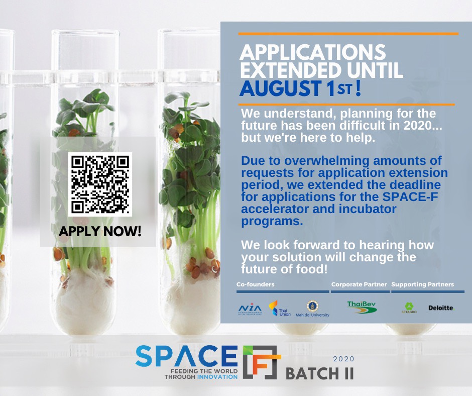 โค้งสุดท้ายของการรับสมัครฟู้ดเทคสตาร์ทอัพของสเปซ-เอฟ (SPACE-F) หรือ โครงการบ่มเพาะและเร่งการเติบโตของสตาร์ทอัพนวัตกรรมอาหารแห่งแรกของโลกที่เกิดขึ้นในประเทศไทย เป็นปีที่ 2 โดยความร่วมมือของสำนักงานนวัตกรรมแห่งชาติ บริษัท ไทยยูเนี่ยน กรุ๊ป จำกัด (มหาชน) จำกัด (มหาชน) และมหาวิทยาลัยมหิดล รวมถึงพันธมิตรใหม่ บริษัท ไทยเบฟเวอเรจ จำกัด (มหาชน) ขยายการรับสมัครฟู้ดเทคสตาร์ทอัพถึงวันที่ 1 สิงหาคม 2563 ผู้สนใจสามารถดูรายละเอียดและสมัครเข้าร่วมโครงการผ่านเว็บไซต์ www.space-f.co