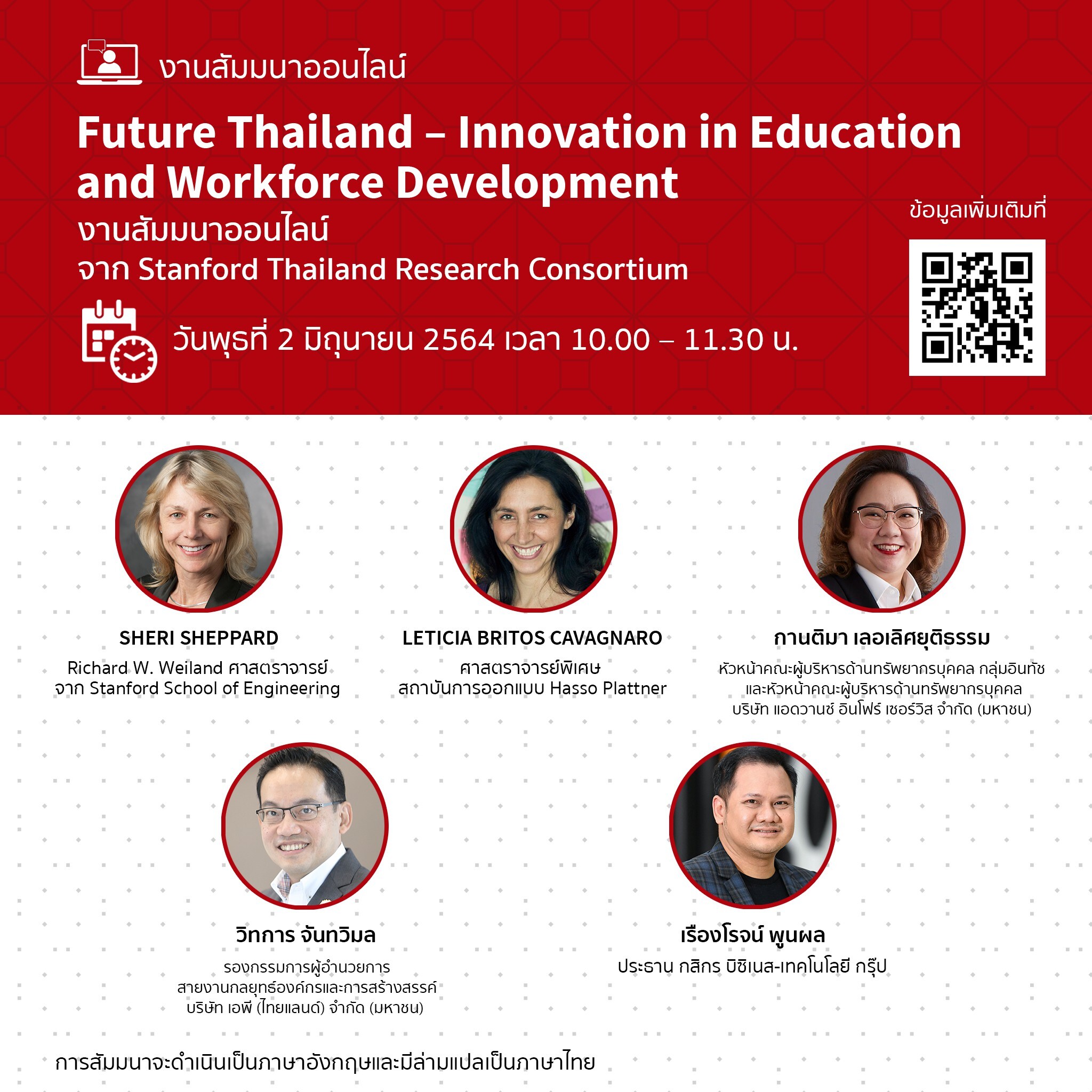 งานสัมมนาออนไลน์ครั้งนี้ จัดขึ้นภายใต้หัวข้อ “Future Thailand — Innovation in Education and Workforce Development” โดยมีผู้ร่วมอภิปราย ได้แก่ คณาจารย์และนักวิจัยในโครงการ ITS จากมหาวิทยาลัยสแตนฟอร์ด ร่วมกับผู้บริหารจากองค์กรชั้นนำในประเทศไทย มุ่งเน้นการอภิปรายเรื่องกลยุทธ์ในการยกระดับความพร้อมของแรงงานในประเทศไทย ตลอดจนการพัฒนาแนวทางปฏิบัติที่ดีที่สุดเพื่อสนับสนุนบุคลากรด้านการศึกษาในการสร้างการมีส่วนร่วมและเตรียมพร้อมเยาวชนของชาติให้ประสบความสำเร็จในการประกอบอาชีพในอนาคต