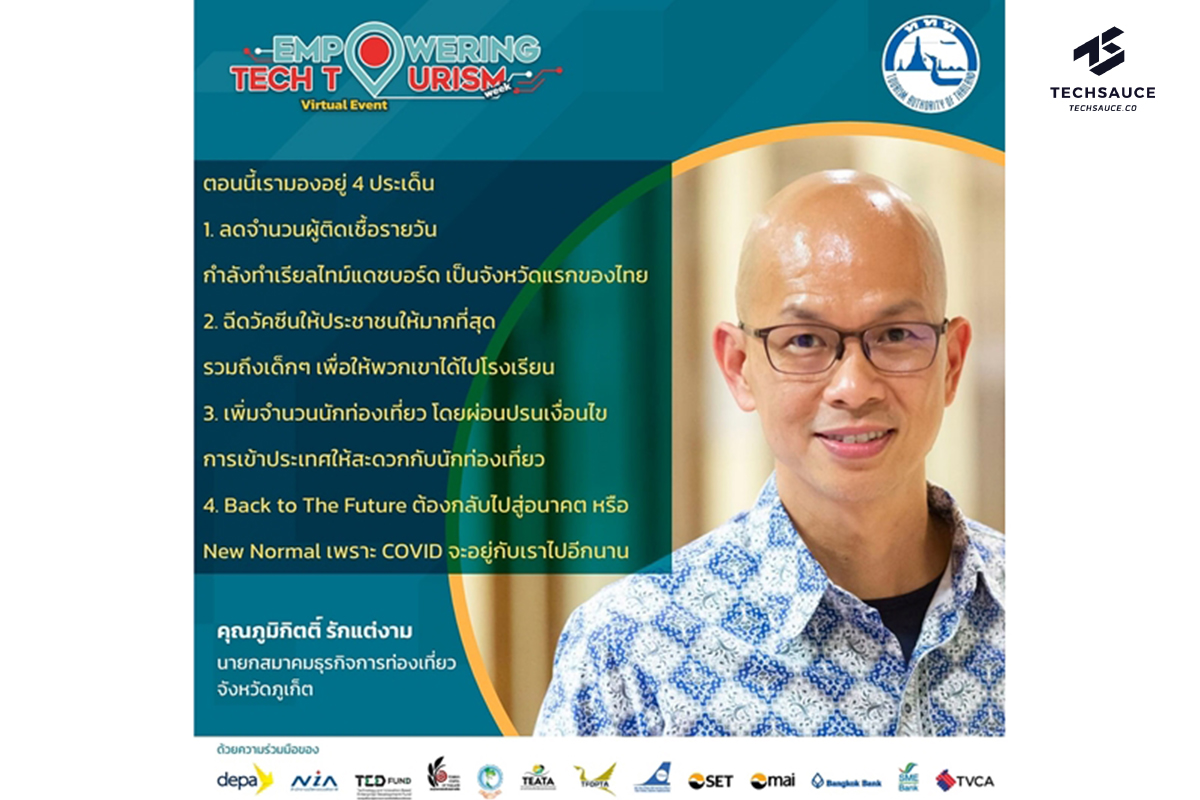 การท่องเที่ยวแห่งประเทศไทย (ททท.) จึงได้เดินหน้าฟื้นฟูอุตสาหกรรมการท่องเที่ยวไทย ดำเนิน “โครงการพัฒนาศักยภาพผู้ประกอบการท่องเที่ยวยุคดิจิทัล” พร้อมจัดงาน “Empowering Tech Tourism week Virtual Event” งานอีเว้นน์ออนไลน์เพื่อการจับคู่ธุรกิจระหว่างผู้พัฒนานวัตกรรมและผู้ประกอบการท่องเที่ยว ที่จัดขึ้นระหว่างวันที่ 6-15 กันยายน นี้ โดยส่วนหนึ่งของงานมีการเสวนาในหัวข้อ “นวัตกรรมจะมาช่วยการท่องเที่ยวในภูเก็ตได้อย่างไร” โดยมีตัวแทนจากภาคธุรกิจในจังหวัดภูเก็ตร่วมแชร์ข้อมูลที่น่าสนใจ
