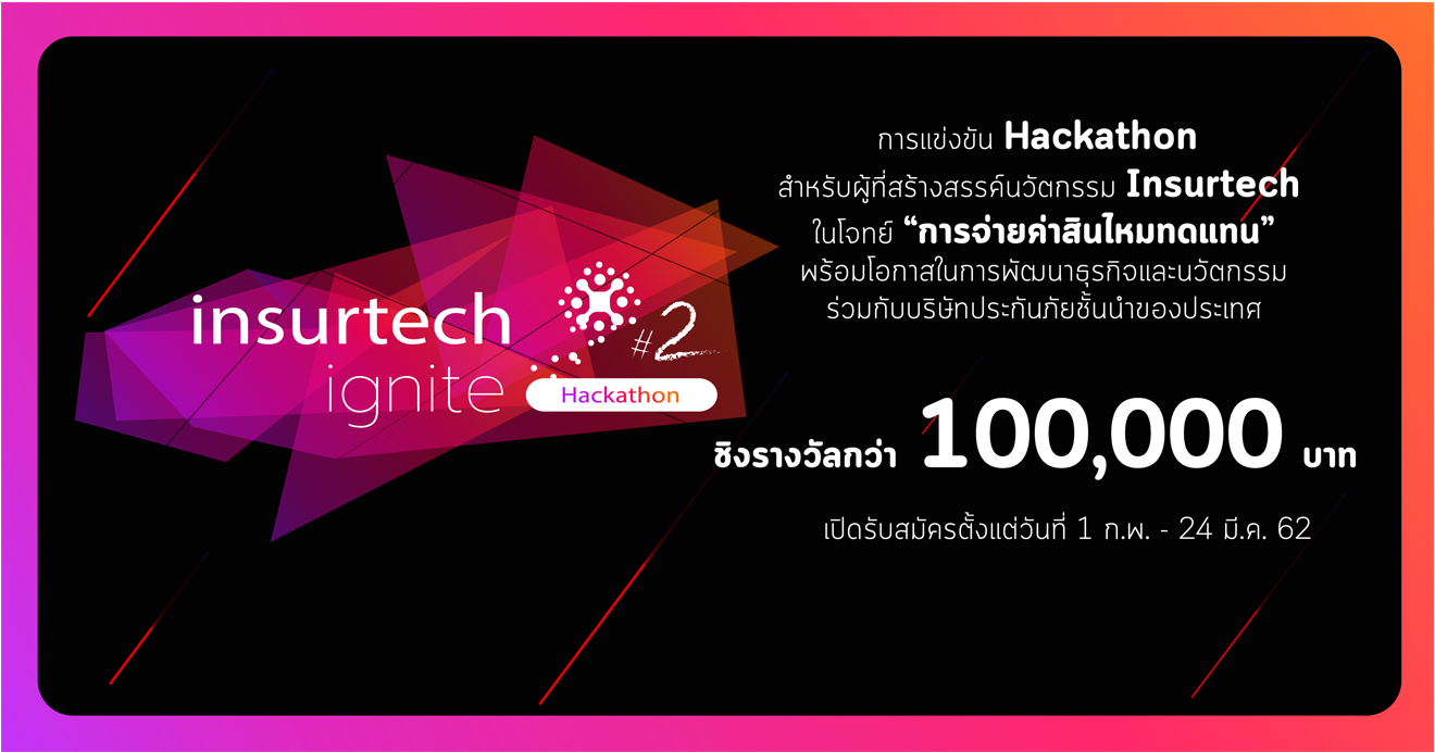 สมาคมประกันวินาศภัยไทยร่วมกับสำนักงานคณะกรรมการการกำกับและส่งเสริมการประกอบธุรกิจประกันภัย (คปภ) ศูนย์ Center of InsurTech, Thailand : CIT และสมาคมฟินเทคประเทศไทย ผลักดันโครงการส่งเสริมและสนับสนุนวงการ Insurtech Startup ขึ้น ภายใต้ชื่องาน “Hackathon Insurtech Ignite #2” นับเป็นครั้งที่ 2 ของการจัดโครงการนี้ โดยทางสมาคมประกันวินาศภัยไทยตระหนักถึงประโยชน์ของ Insurtech ที่เข้ามามีบทบาทกับชีวิตคนยุคนี้มากขึ้น จึงร่วมกับพันธมิตรจัดขึ้นอีกครั้ง เพื่อหาแนวคิดสร้างพัฒนาวงการประกันภัยในไทยที่อยู่ในโจทย์ของ “สะดวก รวดเร็ว และง่าย ต่อการจ่ายค่าสินไหมทดแทน”ชิงเงินรางวัลรวมมูลค่า 100,000 บาท