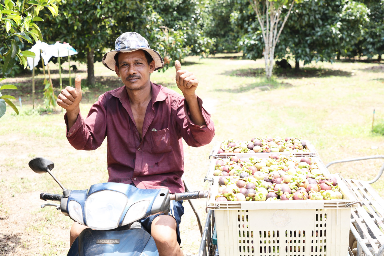 สำหรับเกษตรกรผู้เข้าร่วมโครงการฯ คุณเสาวนีย์ ทองชิว เจ้าของสวนทุเรียน มังคุด และลองกอง จ.จันทบุรี เล่าถึงการดูแลสวนและข้อดีของการมีคนรุ่นใหม่เข้าร่วมโครงการว่า “เดิมสวนของป้าชื่อว่า ‘ไร่บุญมี’ ก่อตั้งมาตั้งแต่สมัยรุ่นพ่อแม่ ซึ่งป้าก็สานต่อทำสวนมาได้ 20 กว่าปีแล้ว โดยสวนนี้มีพื้นที่ 50 กว่าไร่ ปลูกทุเรียน มังคุด และลองกอง ปัจจุบันมีลูกชายและลูกสาวกลับมาช่วยงาน ปรับปรุงและเปลี่ยนแปลงวิธีการทำสวนแบบสมัยใหม่ และคัดเลือกผลผลิตส่งไปยังสหกรณ์การเกษตรเขาคิชฌกูฏ จำกัด เพื่อส่งต่อไปจำหน่ายที่ท็อปส์ รวมถึงมีตลาดเจ้าประจำติดต่อมาเพื่อซื้อขาย