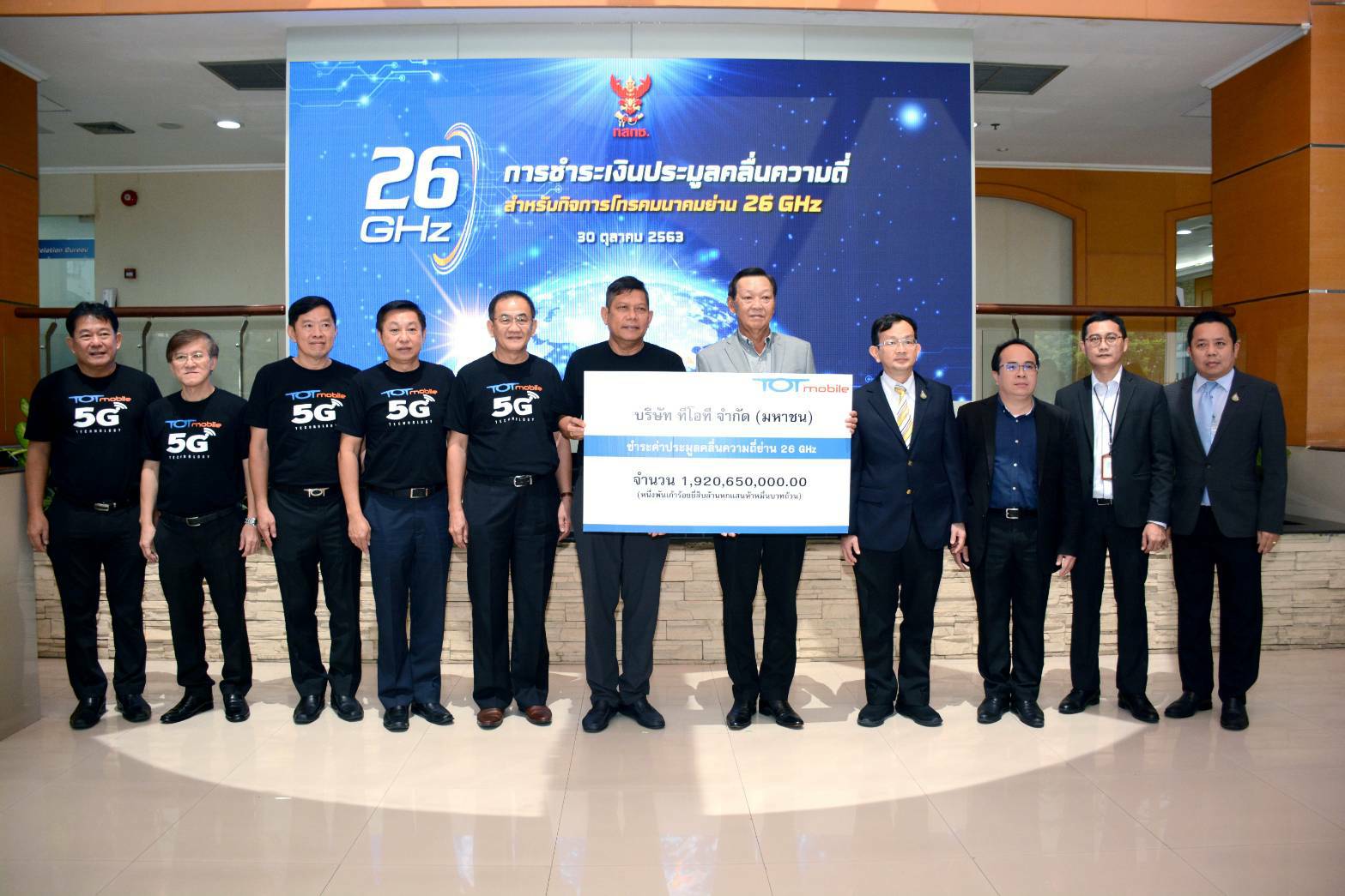 30 ตุลาคม 2563 ณ สำนักงาน กสทช นาวาอากาศเอกสมศักดิ์ ขาวสุวรรณ์ ประธานกรรมการ บริษัท ทีโอที จำกัด (มหาชน) พร้อมด้วย นายมรกต เธียรมนตรี รักษาการกรรมการผู้จัดการใหญ่ บริษัท ทีโอที จำกัด (มหาชน) ชำระเงินค่าประมูลใบอนุญาตคลื่นความถี่ย่าน 26 GHz จำนวน 1,920,650,000 บาท โดยมี พลเอกสุกิจ ขมะสุนทร ประธานคณะกรรมการกิจการกระจายเสียง กิจการโทรทัศน์ และกิจการโทรคมนาคมแห่งชาติ (กสทช.) เป็นผู้รับมอบ และนายประวิทย์ ลี่สถาพรวงศา กรรมการกิจการกระจายเสียง กิจการโทรทัศน์ และกิจการโทรคมนาคมแห่งชาติ นายพิพัฒน์ ขันทอง กรรมการ บริษัท ทีโอที จำกัด (มหาชน) ร่วมเป็นสักขีพยาน