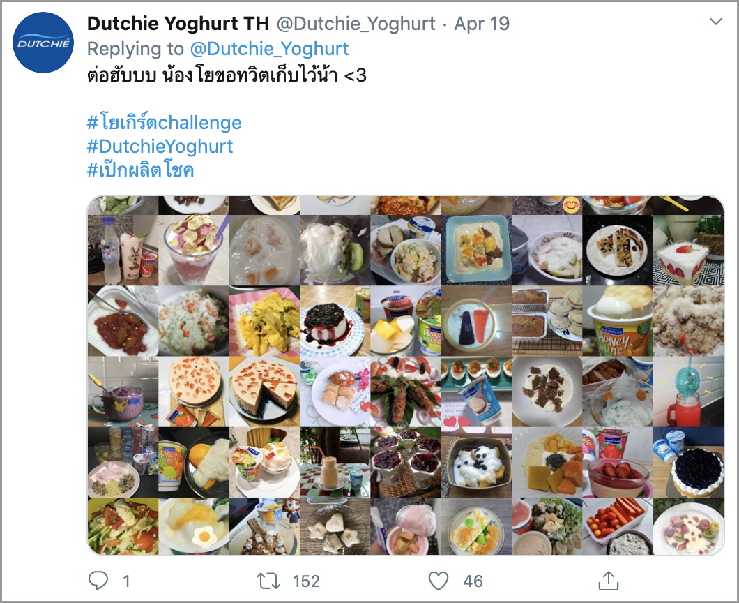 การกินอาหารนอกบ้านน้อยลง หมายถึงการต้องทำอาหารเองที่บ้านหรือการต้องกินอาหารที่บ้านเพิ่มมากขึ้น ซึ่งนำไปสู่บทสนทนาบนทวิตเตอร์ถึงความท้าทายในเรื่องของอาหารที่เพิ่มขึ้น ความท้าทายในช่วงกักตัวนำพาให้นักชิมหรือสายกินในทวิตเตอร์มารวมตัวกันแล้วทวีตภาพความสำเร็จของการใช้ศาสตร์และศิลป์ในการทำอาหารด้วยการติดแฮชแท็ก #เมนูกักตัวchallenge ในขณะที่แบรนด์อย่าง Dutchie Yoghurt TH (@Dutchie_Yoghurt) ก็ไม่รอช้า เข้ามามีส่วนร่วมด้วยการเปิดตัวชาเลนจ์ในการนำโยเกิร์ตไปเป็นวัตถุดิบในเมนูอาหารจานอร่อยด้วยแฮชแท็ก #โยเกิร์ตChallenge