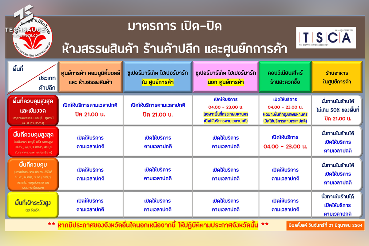 สำหรับศูนย์การค้าและห้างสรรพสินค้า รวมถึง ซูเปอร์มาร์เก็ต ไฮเปอร์มาร์ท ร้านอาหารที่ดำเนินการอยู่ในศูนย์การค้า ซึ่งตั้งอยู่ในพื้นที่สีแดงเข้ม (พื้นที่ควบคุมสูงสุดและเข้มงวด) จะยังคงกำหนดเวลาให้บริการถึง 21.00 น. ทั้งนี้ ร้านอาหารในศูนย์การค้าสามารถนั่งรับประทานอาหารในร้านได้ 50% ของพื้นที่ และสามารถนั่งได้ถึง 21.00 น. เหมือนเดิม