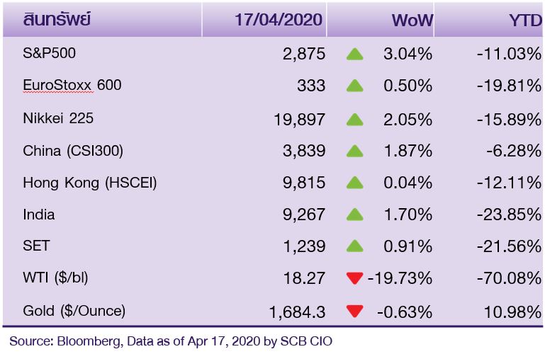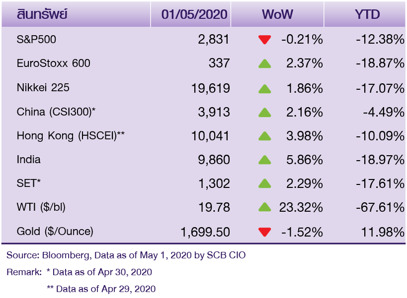 จากการผ่อนคลายมาตรการปิดเมือง (Lockdown) ในหลายประเทศ และความคาดหวังในการพัฒนาวัคซีน / ยาต้านโควิด-19 รวมถึงการที่ธนาคารกลางหลักต่างๆ ซึ่งรวมถึง Fed, ธนาคารกลางยุโรป (ECB) และ BoJ ส่งสัญญาณดำเนินนโยบายการเงินเชิงผ่อนคลายต่อเนื่อง และน่าจะพร้อมออกมาตรการอื่นๆ เพิ่มเติม หากมีความจำเป็น ขณะที่รัฐบาลของหลายประเทศ ได้ออกมาตรการทางการคลังจำนวนมาก เพื่อบรรเทาผลกระทบจากโรคโควิด-19 ที่มีต่อภาคธุรกิจ ด้านความผันผวนของราคาน้ำมัน น่าจะปรับลดลง หลังกองทุน US Oil Fund ได้เสร็จสิ้นการขายสัญญาล่วงหน้าน้ำมันดิบที่จะครบกำหนดในเดือนมิ.ย. ที่ถือครองอยู่ทั้งหมด เพื่อเปลี่ยนรูปแบบในการลงทุนใหม่