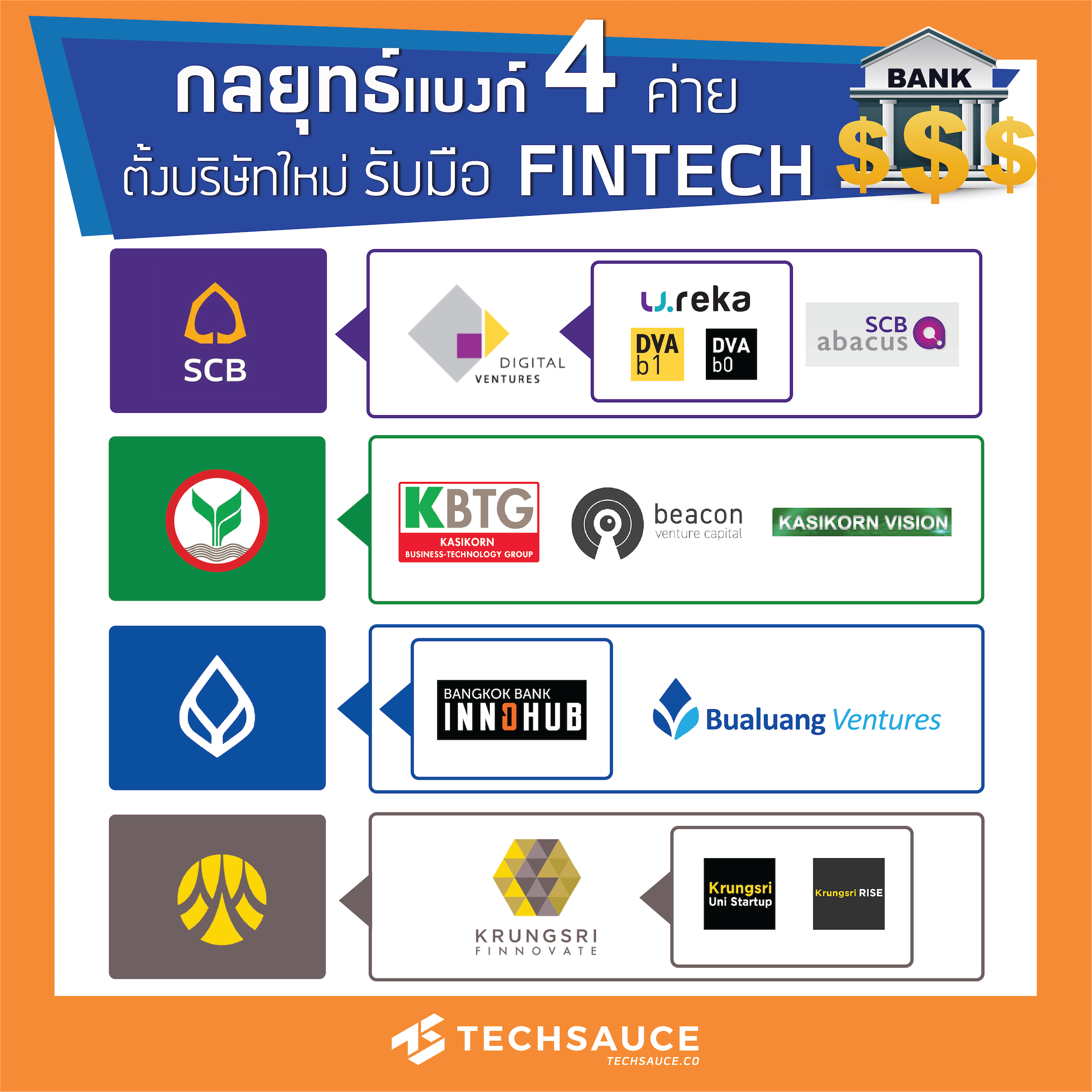 ธนาคารที่ได้ขึ้นชื่อว่า มีสินทรัพย์มากที่สุดของไทย มีการจัดตั้ง Corporate Venture Capital และโครงการที่สนับสนุน FinTech ดังต่อไปนี้