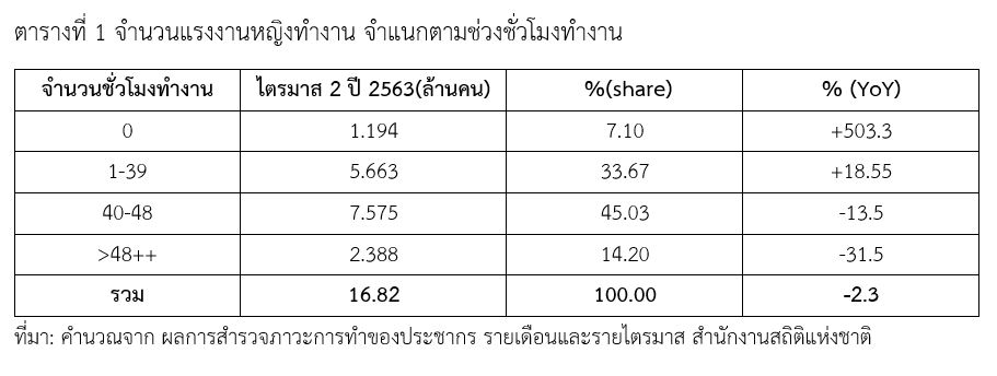 ผลการศึกษาพบว่าแรงงานหญิงทำงานระหว่าง 40-48 ชั่วโมงจำนวนลดลงจาก 8.76 ล้านคนเป็น 7.575 ล้านคนหรือร้อยละ 13.5 (YoY) และทำงาน มากกว่า 48 ชั่วโมงลดลง จำนวน 2.388 ล้านคนหรือร้อยละ 31.5 (YoY) กล่าวโดยสรุปก็คือ แรงงานหญิงมีทั้งยังไม่ได้ทำงาน ทำงานต่ำระดับและไม่ได้ทำงานล่วงเวลา (OT) รวมแล้วไม่ต่ำกว่า 16.82 ล้านคนที่ต้องเผชิญกับปัญหาไม่มีรายได้หรือมีรายได้น้อยลงจนไม่สามารถช่วยเหลือการเงินครอบครัวได้เหมือนช่วงก่อนโควิด-19 ระบาด (ตารางที่ 1)