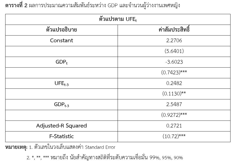 ผลการประมาณค่าความสัมพันธ์ระหว่าง GDP และจำนวนผู้ว่างงานเพศหญิง จากแบบจำลอง ดังตารางที่ 1 พบว่า อัตราการเปลี่ยนแปลง GDP ลดลงร้อยละ 1 (YoY) ส่งผลให้ อัตราการเปลี่ยนแปลงจำนวนผู้ว่างงานเพศหญิงเพิ่มขึ้นร้อยละ 3.60 (YoY) นอกจากนี้ อัตราการเปลี่ยนแปลง GDP ใน 3 ไตรมาสที่แล้ว ยังส่งผลต่อจำนวนผู้ว่างเพศหญิงในไตรมาสปัจจุบัน