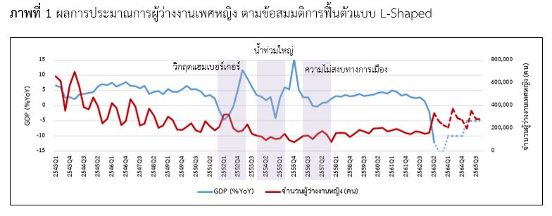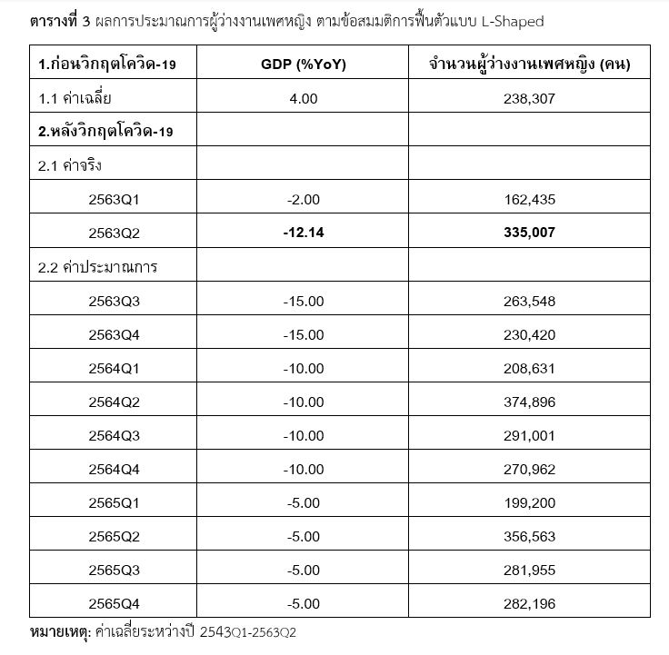 เดิมทีช่วงก่อนวิกฤตโควิด-19 อัตราการเติบโตของ GDP ในประเทศไทย เติบโตเฉลี่ย เท่ากับร้อยละ 4.00 (YoY) และจำนวนผู้ว่างงานเพศหญิงเฉลี่ย 238,307 คน จากตารางที่ 3 เมื่อเกิดวิกฤตโควิด-19 ส่งผลให้ GDP ของประเทศไทยถดถอยลดลงร้อยละ -12.14 (YoY) ในไตรมาสที่ 2 ของปี 2563 จำนวนผู้ว่างงานเพศหญิงเพิ่มสูงขึ้นเป็น 335,007 คน ทั้งนี้ภายใต้ข้อสมมติการฟื้นตัว GDP แบบ L-Shaped ซึ่งเป็นกรณีที่ GDP ถดถอยอย่างรุนแรง ไม่พบสัญญาณการฟื้นตัวในระยะเวลา 3 ปี ส่งผลให้จำนวนผู้ว่างงานเพศหญิงในไตรมาส 2 ปี 2564 และปี 2565 อาจเพิ่มเป็น 374,896 คน และ 356,563 คนตามลำดับ ในช่วงเวลาประมาณการ หรือมากกว่าร้อยละ 94 ถึง ร้อยละ 117 หากเทียบกับจำนวนผู้ว่างงานเพศหญิงช่วงก่อนการเกิดวิกฤตโควิด-19