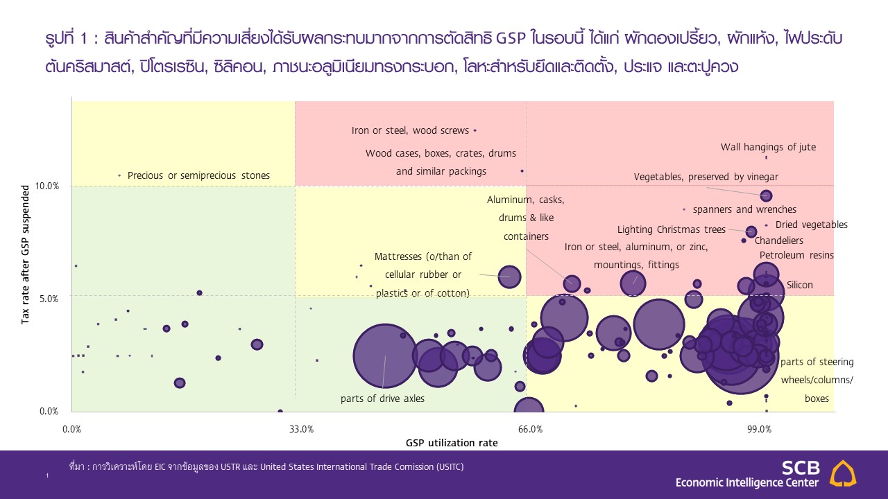 โดยจากเกณฑ์ข้างต้น สามารถแสดงผลได้ดังรูปที่ 1 ซึ่งสังเกตได้ว่าสินค้าที่มีมูลค่าการใช้สิทธิสูงส่วนใหญ่จะกระจุก ตัวอยู่มุมขวาล่างของภาพ สะท้อนว่าสินค้าดังกล่าวมีสัดส่วนการใช้สิทธิ GSP สูง แต่จะโดนภาษีเพิ่มเติมในระดับที่ไม่สูงนัก (สินค้าสำคัญที่มีมูลค่ามากคือ ชิ้นส่วนรถยนต์จำพวกแกนพวงมาลัยและกระปุกเกียร์) จึงทําให้เข้าข่ายความเสี่ยงปานกลาง (พื้นที่สีเหลือง) ขณะที่สินค้าที่มีความเสี่ยงสูง (พื้นที่สีแดง) คือสินค้าที่มีอัตราการใช้สิทธิ GSP ในระดับสูง และจะโดนเก็บภาษีในอัตราที่สูงขึ้นมาก ได้แก่ ผักดองเปรี้ยว, ผักแห้ง, ไฟประดับต้นคริสมาสต์, ปิโตรเรซิน, ซิลิคอน, ภาชนะอะลูมิเนียมทรงกระบอก, โลหะสำหรับยึดและติดตั้ง, ประแจ และตะปูควง