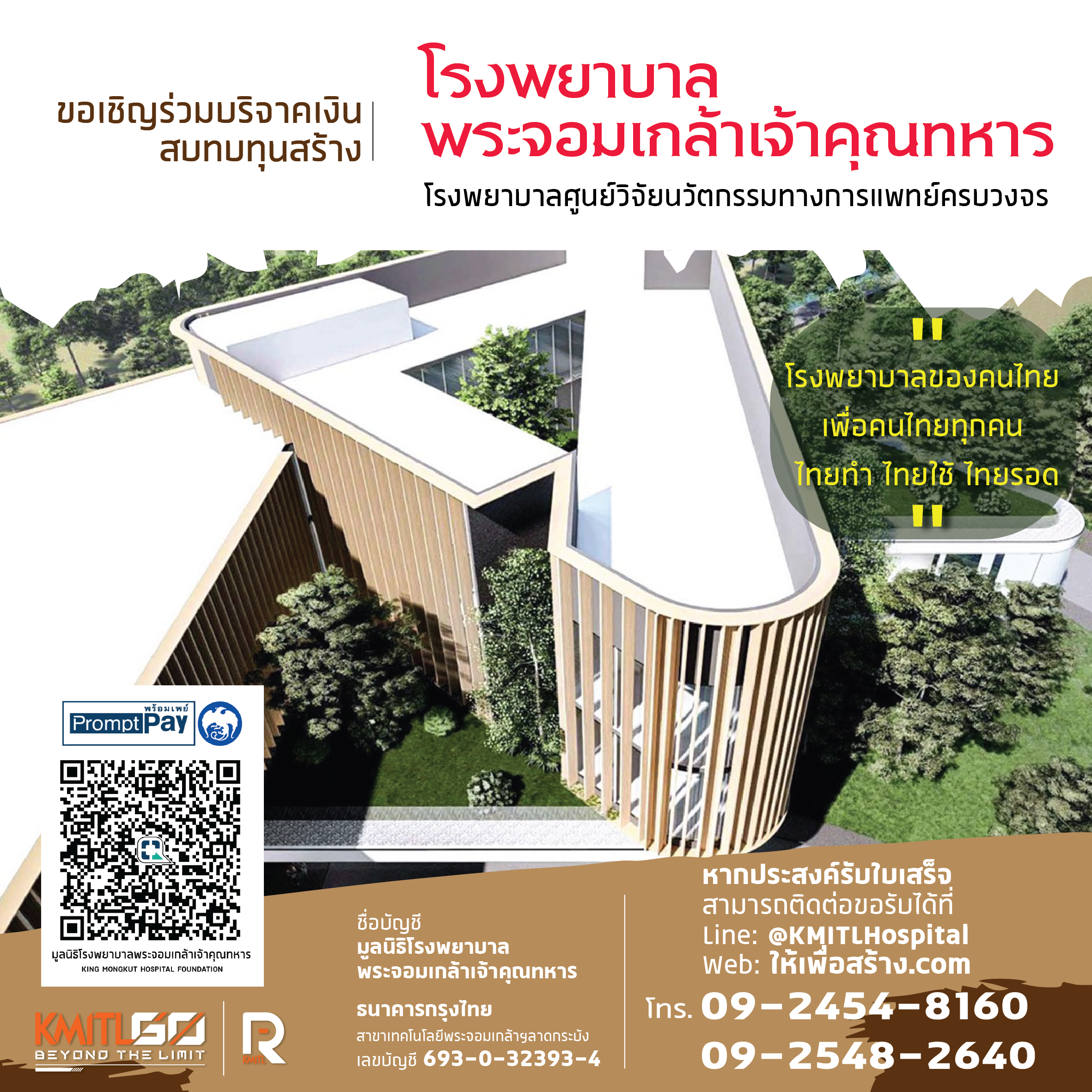 • โอนเข้า บัญชี “มูลนิธิโรงพยาบาลพระจอมเกล้าเจ้าคุณทหารฯ” ธนาคารกรุงไทย เลขที่ 693-0-32393-4