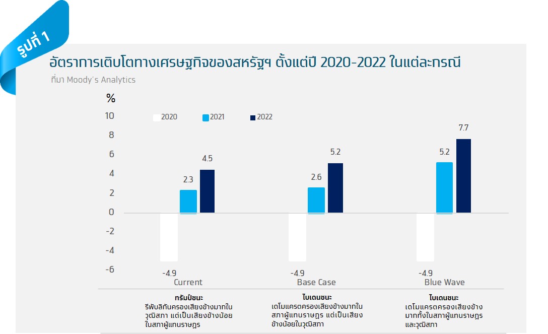 แม้ว่าเศรษฐกิจสหรัฐฯ จะขยายตัวได้ไม่เท่ากับกรณี Blue Wave Victory แต่คาดว่าจะส่งผลต่อการฟื้นตัวของเศรษฐกิจโลก จากผลการศึกษาของ Moody’s Analytics พบว่า เศรษฐกิจสหรัฐฯ จะขยายตัวได้มากที่สุดในกรณีที่พรรคเดโมแครตชนะการเลือกตั้งทุกสนามหรือที่เรียกว่า Blue Wave Victory โดยเศรษฐกิจจะขยายตัวได้น้อยลง หากพรรคเดโมแครตชนะในการเลือกตั้ง ปธน. และครองเสียงข้างมากในสภาผู้แทนราษฎร แต่ไม่สามารถครองเสียงข้างมากในวุฒิสภา (รูปที่ 1) อย่างไรก็ดี การผลักดันนโยบายที่ช่วยสนับสนุนการฟื้นตัวของเศรษฐกิจอาจไม่ง่ายอย่างที่คิด นโยบายหลักของ (ว่าที่) ปธน. ไบเดน อาจถูกสกัดจากฝั่งวุฒิสภาที่รีพับลิกันครองเสียงข้างมากอยู่ โดยมองว่า นโยบายหลักที่ต้องตราเป็นกฎหมาย เช่น นโยบายภาษีและการใช้จ่ายด้านโครงสร้างพื้นฐานอาจถูกต่อรองจากวุฒิสภา ซึ่งจะทำให้นโยบายของไบเดนไม่สามารถดำเนินได้ทันทีตามที่ได้หาเสียงไว้ อย่างไรก็ตาม คาดว่า ว่าที่ ปธน. ไบเดน อาจใช้คำสั่ง ปธน.สหรัฐฯ หรือ Executive Order ในบางนโยบายที่จำเป็นเร่งด่วน