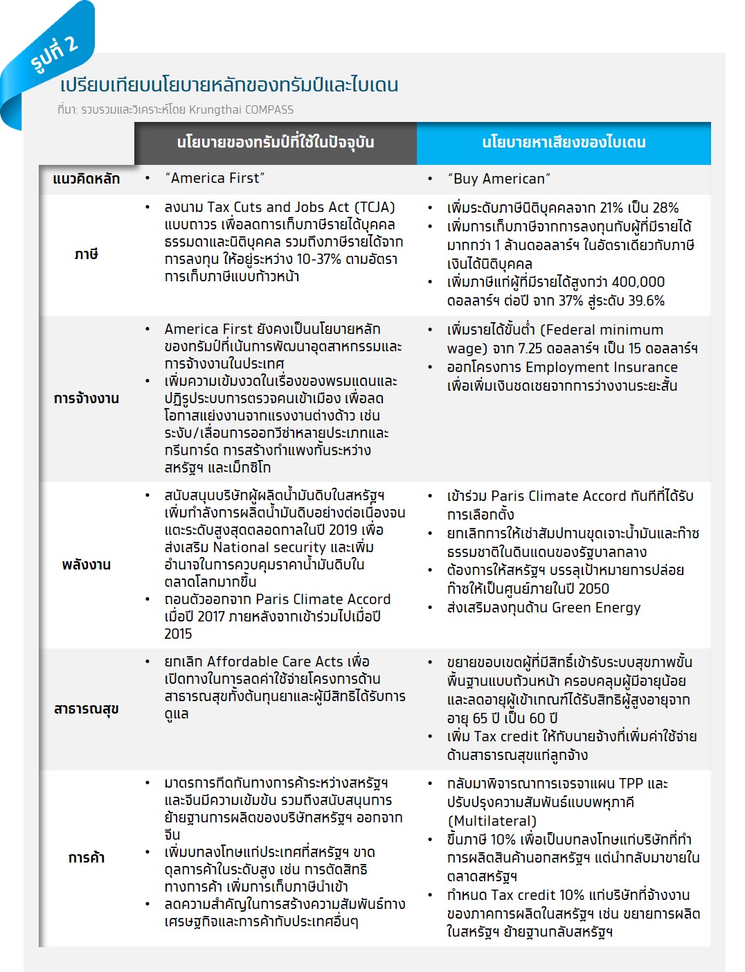 บรรยากาศการค้าของสหรัฐฯ กับคู่ค้ามีแนวโน้มผ่อนคลายมากขึ้น ที่ผ่านมา การมุ่งเดินหน้าทำสงครามการค้ากับจีนของสหรัฐฯ มักเป็นไปเพื่อการตอบโต้ท่าทีของจีนโดยตรง ซึ่งมักไม่ได้ผ่านการเห็นชอบหรือการอนุมัติจากสภา แต่ยุทธศาสตร์ของไบเดนจะเป็นการทำสงครามทางอ้อมหรือเป็นการ “โอบล้อม” จีนผ่านความร่วมมือทางการค้ากับประเทศอื่นๆ เพื่อเพิ่มอำนาจการต่อรองของสหรัฐฯ ในเวทีโลก ทำให้ในระยะข้างหน้า มองว่า ไบเดนซึ่งมีแนวคิดแบบอนุรักษ์นิยมจะนำสหรัฐฯ กลับเข้าแข่งขันทางการค้ากับชาติอื่นๆ ให้เป็นไปอย่างเท่าเทียม (Level-playing field) และอยู่ภายใต้กฎกติกา (Rule-based) มากขึ้นกว่าสมัยที่ทรัมป์เป็น ปธน. เช่น การกลับเข้าร่วมกับองค์การการค้าโลก (WTO) (หลังจากที่ทรัมป์ขู่จะถอนตัวจากสนธิสัญญา GPA ภายใต้การกำกับของ WTO หลังจากที่ WTO ตัดสินให้สหรัฐฯ มีความผิดฐานเก็บภาษีนำเข้าจากจีนและละเมิดกฎระเบียบการค้าระหว่างประเทศหลายข้อ รวมถึงช่องโหว่ทางกฎหมายที่ทำให้สหรัฐฯ เสียเปรียบทางการค้า)