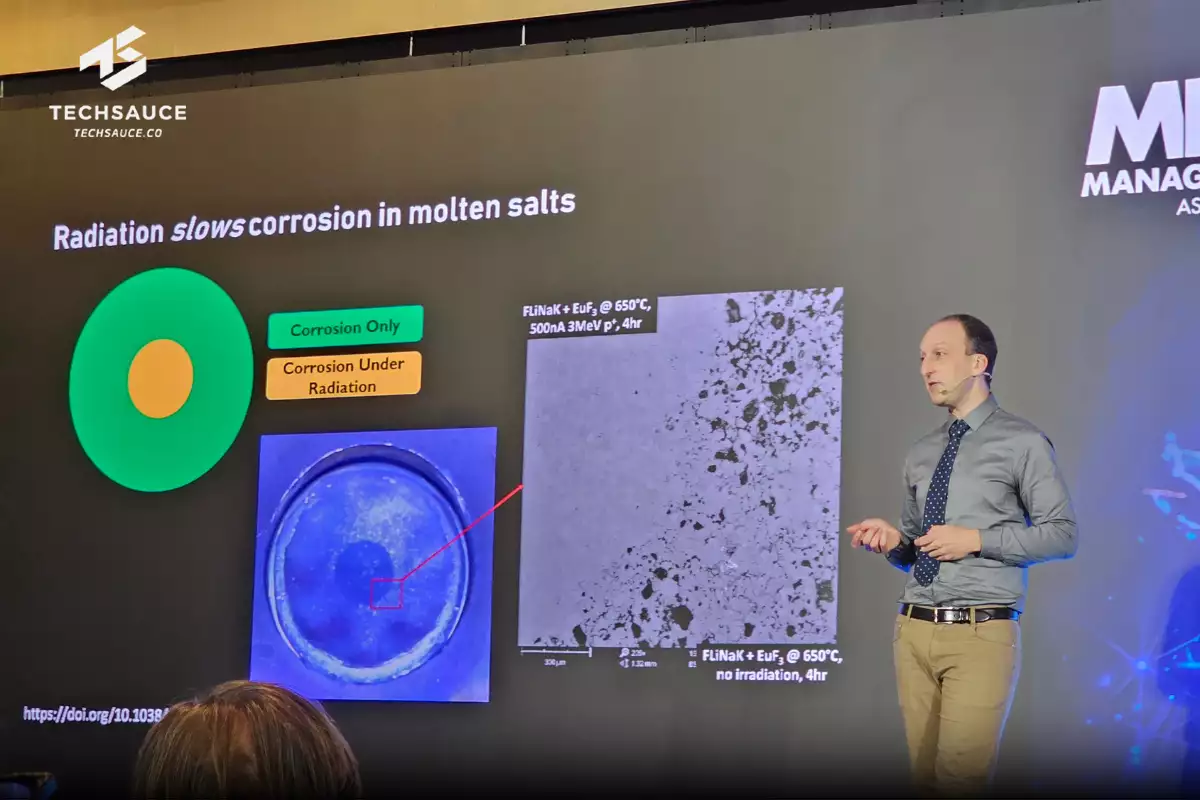 แน่นอนว่าทุกเทคโนโลยีใหม่ย่อมมีความท้าทาย ศาสตราจารย์ Michael Short ทิ้งท้ายในประเด็นทางเทคนิคเกี่ยวกับการกัดกร่อนและรังสี (Radiation and Corrosion) เมื่อชิ้นส่วนใหม่ๆ ถูกนำไปวางในสภาพแวดล้อมที่มีรังสีสูงใน SMR ทีมวิจัยของ MIT ได้ค้นพบสิ่งที่น่าประหลาดใจจากการทดลองยิงลำอนุภาคโปรตอนใส่โลหะในเกลือหลอมเหลว ผลปรากฏว่ารังสีกลับช่วยยับยั้งการกัดกร่อนในบางกรณี ซึ่งขัดกับสัญชาตญาณเดิม การค้นพบเหล่านี้เป็นกุญแจสำคัญที่จะทำให้มั่นใจว่า SMR จะปลอดภัยและทนทานในระยะยาว