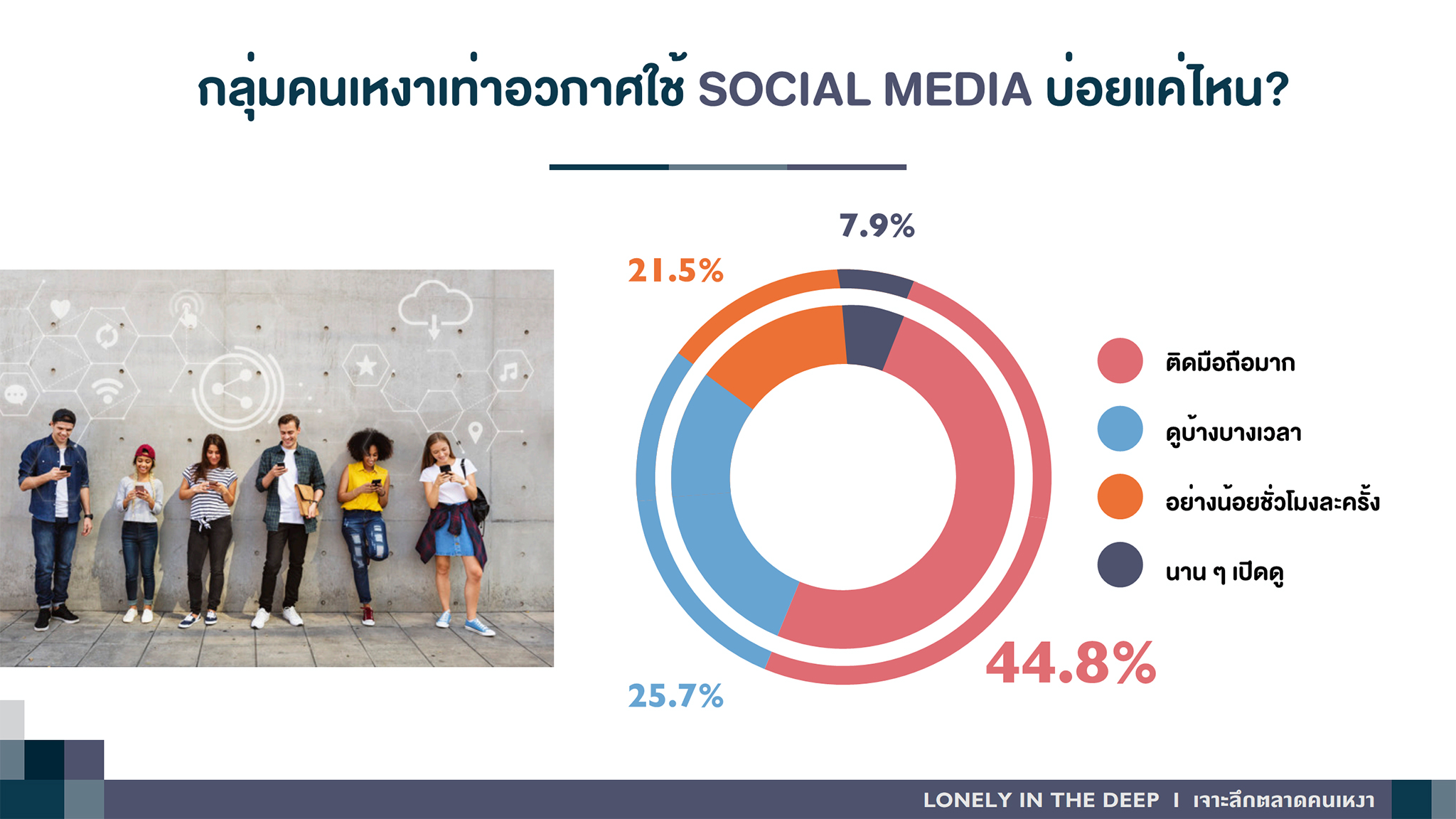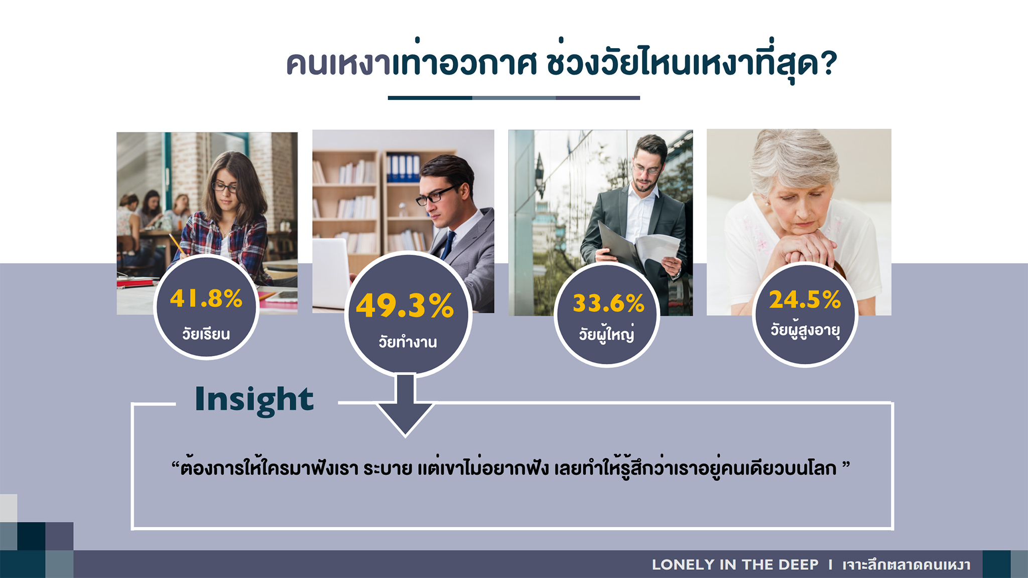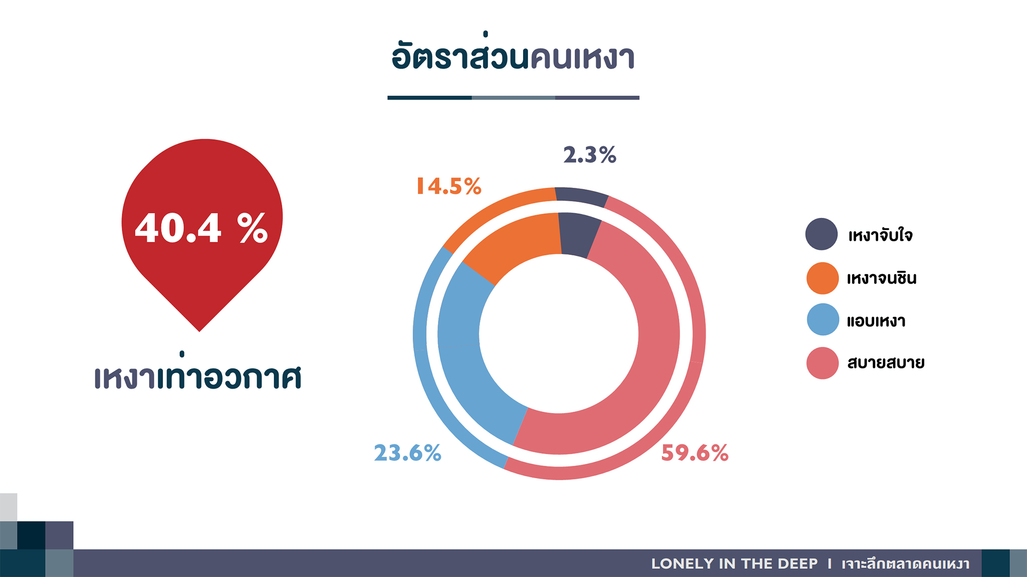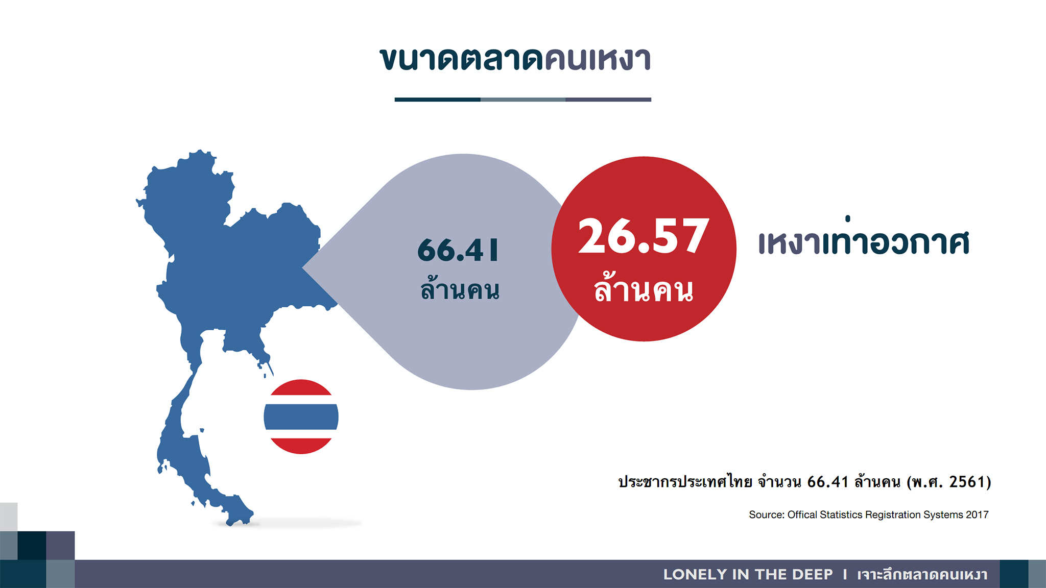 จากงานวิจัยพบว่า ปัจจุบันตัวเลขตลาดคนเหงาในประเทศไทย มีจำนวนสูงกว่า 26.75 ล้านคน ซึ่งกลุ่มผู้มีภาวะความเหงาสูงสุด ได้แก่ วัยรุ่น และวัยทำงาน ในอัตราร้อยละ 33 และร้อยละ 34.7 ตามลำดับ