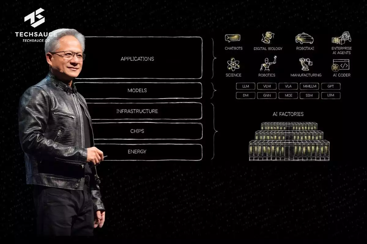 เมื่อมอง AI ในระดับอุตสาหกรรม Jensen Huang แบ่งออกมาเป็นภาพเค้ก 5 ชั้น เรียงจากล่างขึ้นบน ได้แก่