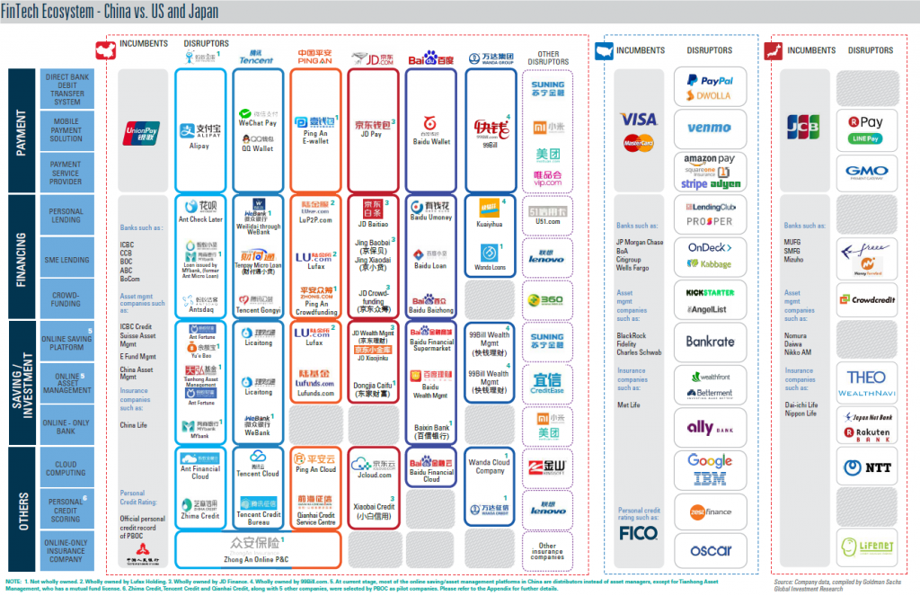 นอกจากนี้ Alipay ยังดำเนินธุรกิจ Taobao ซึ่งเป็นบริษัทอีคอมเมิร์ชที่ใหญ่ที่สุดในประเทศจีน ส่วน WeChat Pay เป็นแอพพลิเคชันรับส่งข้อความที่ได้รับความนิยมมากที่สุด ซึ่งข้อได้เปรียบเหล่านี้ทำให้ Alipay และ WeChat Pay กลายเป็นสองระบบการชำระเงินที่ได้รับความนิยมที่สุดในตลาดจีน โดยตามรายงานของ iResearch คิดเป็นร้อยละ 54 และ 40 ตามลำดับ