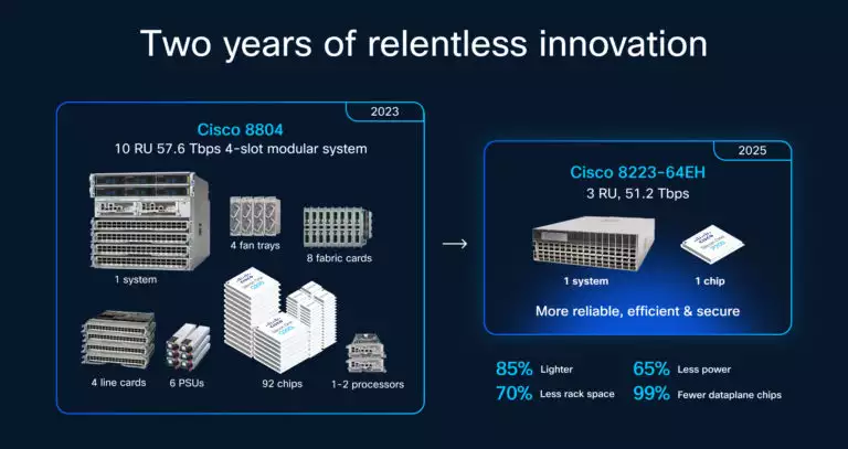 Cisco ระบุว่าชิป P200 รุ่นใหม่มีพลังประมวลผลเทียบเท่าชิปรุ่นก่อนถึง 92 ตัวรวมไว้ในชิปเดียว และช่วยลดการใช้พลังงานของระบบเราท์เตอร์รุ่น 8223 ได้มากถึง 65% - Credit: Cisco
