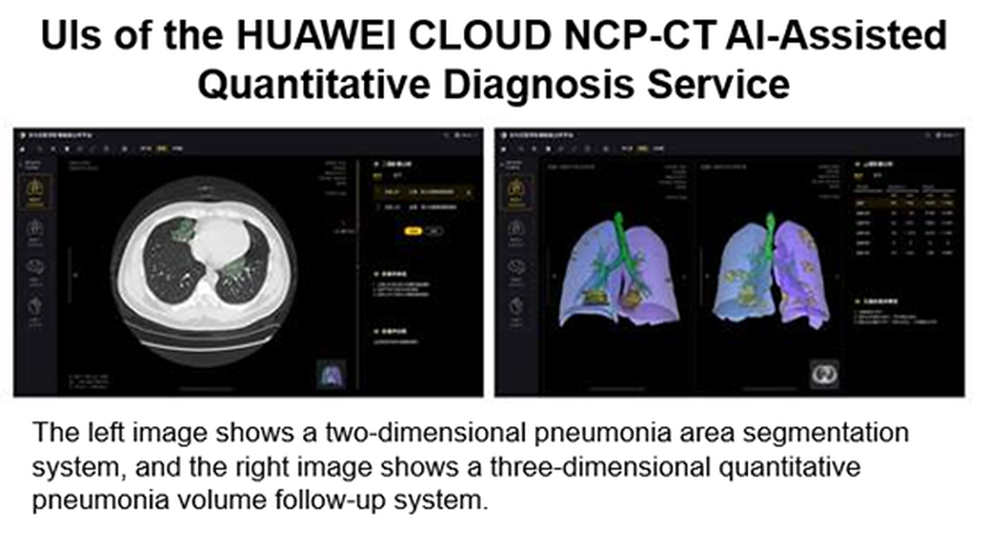 เมื่อเร็วๆ นี้ HUAWEI CLOUD จึงได้ร่วมมือกับมหาวิทยาลัย Huazhong University of Science & Technology และบริษัท Lanwon Technology พัฒนาและเปิดตัวบริการผู้ช่วย AI วิเคราะห์รูปภาพทางการแพทย์เชิงปริมาณสำหรับโรค COVID-19 ด้วยเทคโนโลยี AI ชั้นนำของ HUAWEI CLOUD อย่างคอมพิวเตอร์วิทัศน์ (computer vision) และ การวิเคราะห์รูปภาพทางการแพทย์ บริการดังกล่าวจะสามารถรายงานผลการตรวจ (CT quantification) ให้แก่รังสีแพทย์และอายุรแพทย์ได้โดยอัตโนมัติ รวดเร็ว และถูกต้อง ช่วยแก้ไขสถานการณ์การขาดแคลนรังสีแพทย์ที่สามารถวินิจฉัยโรค COVID-19 อย่างแม่นยำ รวมทั้งช่วยลดความกดดันในงานด้านการกักตัวผู้ป่วย และช่วยลดภาระงานของแพทย์ได้เป็นอย่างมาก บริการดังกล่าวยังใช้ประโยชน์จากความสามารถด้านการคำนวณอันทรงพลังของชิป AI ในซีรีส์ Ascend ของหัวเว่ยเพื่อให้ได้ผลลัพธ์ที่รวดเร็วและลดขั้นตอน (quantization) ของเคสหนึ่งภายในเวลาเพียงไม่กี่วินาที ทั้งนี้ ระบบการใช้ "AI การวินิจฉัยของแพทย์" รวดเร็วกว่าการวิเคราะห์ภาพเชิงปริมาณด้วยมนุษย์เพียงอย่างเดียวหลายสิบเท่า ซึ่งทำให้เพิ่มประสิทธิภาพในการวินิจฉัยโรคขึ้นอย่างมาก